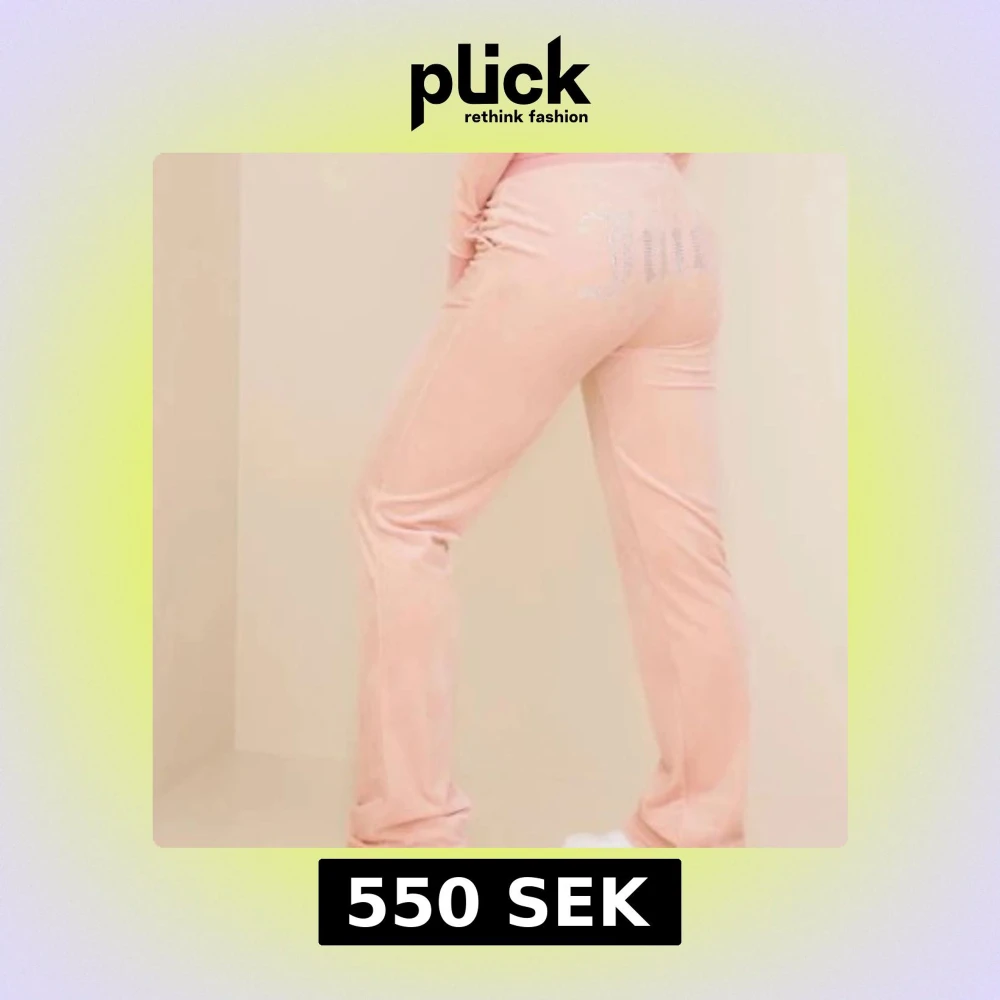Säljer ett par ljusrosa mjukisbyxor från Juicy Couture i mjuk velour. Byxorna har bootcut-modell och strassdetaljer med Juicy-loggan på baksidan. Perfekta för en chill och trendig look. Använda fåtal gånger, inga effekter. Nypris:1100kr