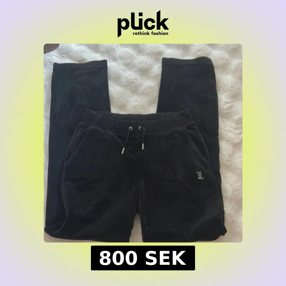 Svarta mjukisbyxor från Juicy Couture i storlek S, med glittrande strassdetaljer på fickan och stor 'Juicy'-text på baken. Byxorna har snörning i midjan och är gjorda i mjuk sammet för en lyxig och chill vibe.