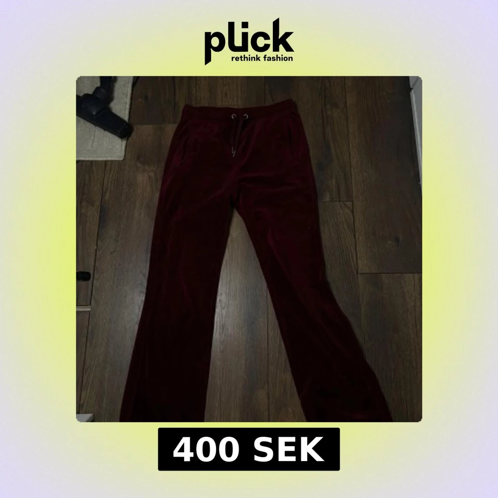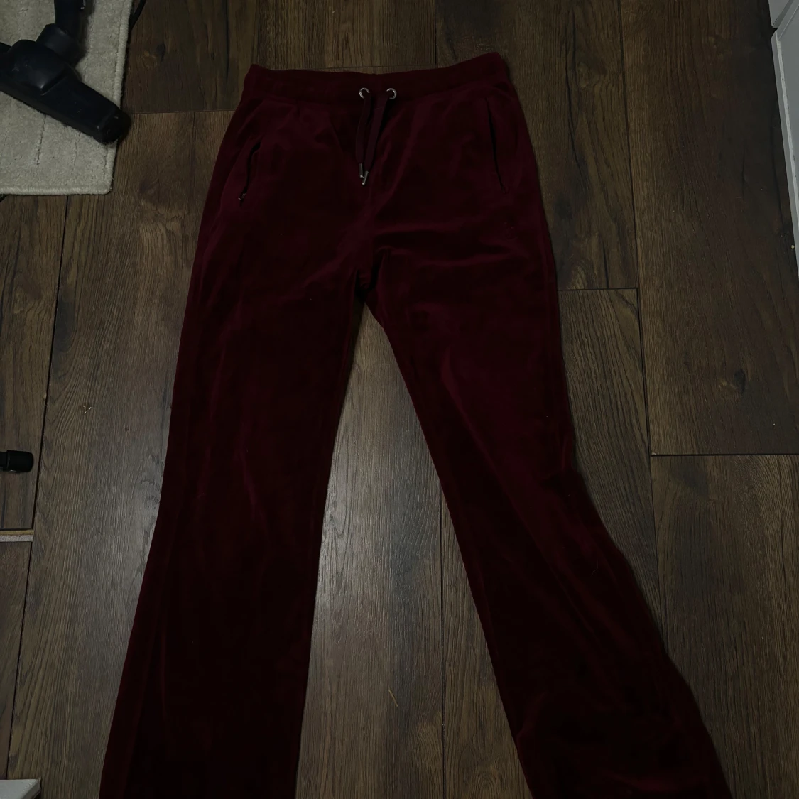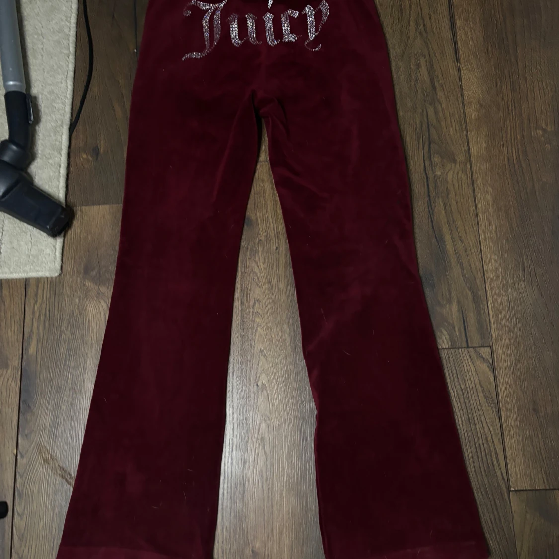 Mysiga vinröda mjukisbyxor från Juicy Couture i mjuk velour med snörning i midjan och fickor fram. Bak på byxan står det 'Juicy' i glittriga stenar. Perfekta för en chill och trendig look.
