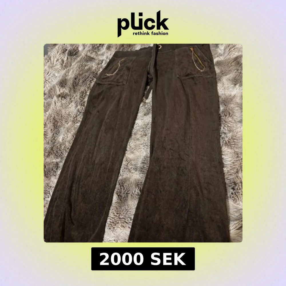 Mörkbrunt set från Juicy Couture i mjuk velour. Byxorna har snörning i midjan, fickor med guldfärgade kedjedetaljer och dragkedjor. Klassisk bootcut-modell med bekväm passform och exklusiv känsla. Storlek S i båda. Vintage så lite skavanker finns
