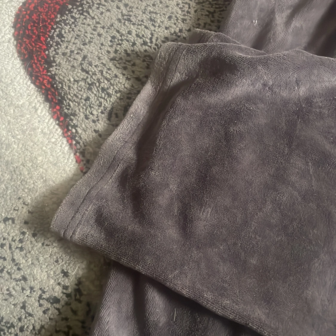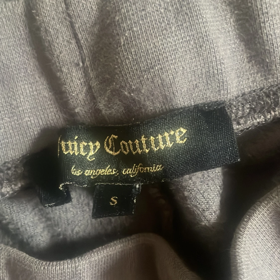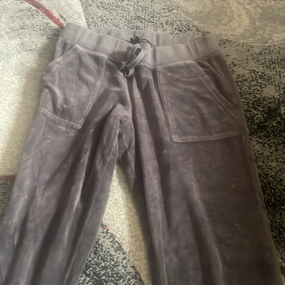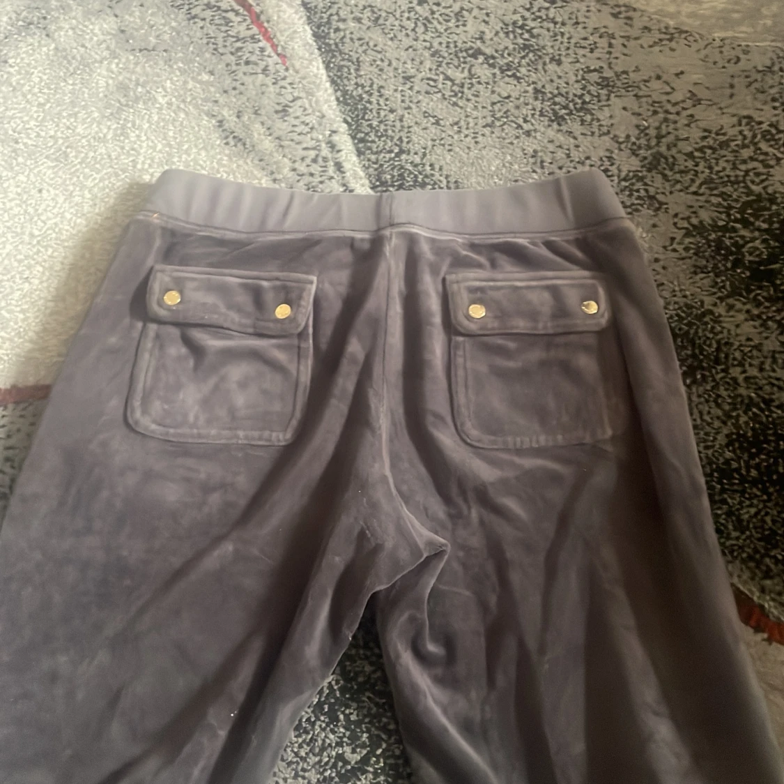 Mysiga grå mjukisbyxor från Juicy Couture i velour med bred resår i midjan och snörning. Byxorna har stora fickor fram och bak med guldiga knappar på bakfickorna. Perfekta för en chill och trendig look.