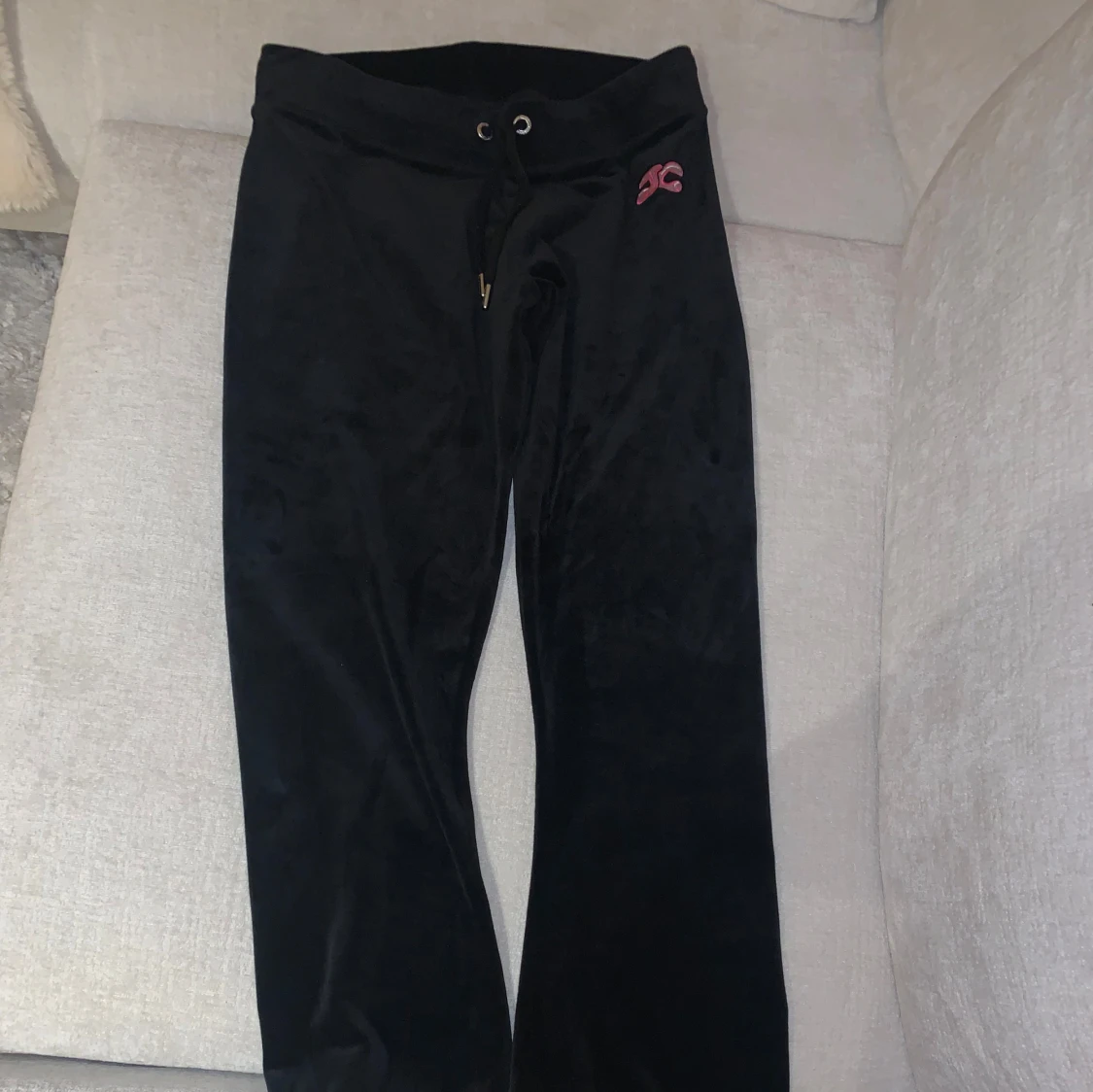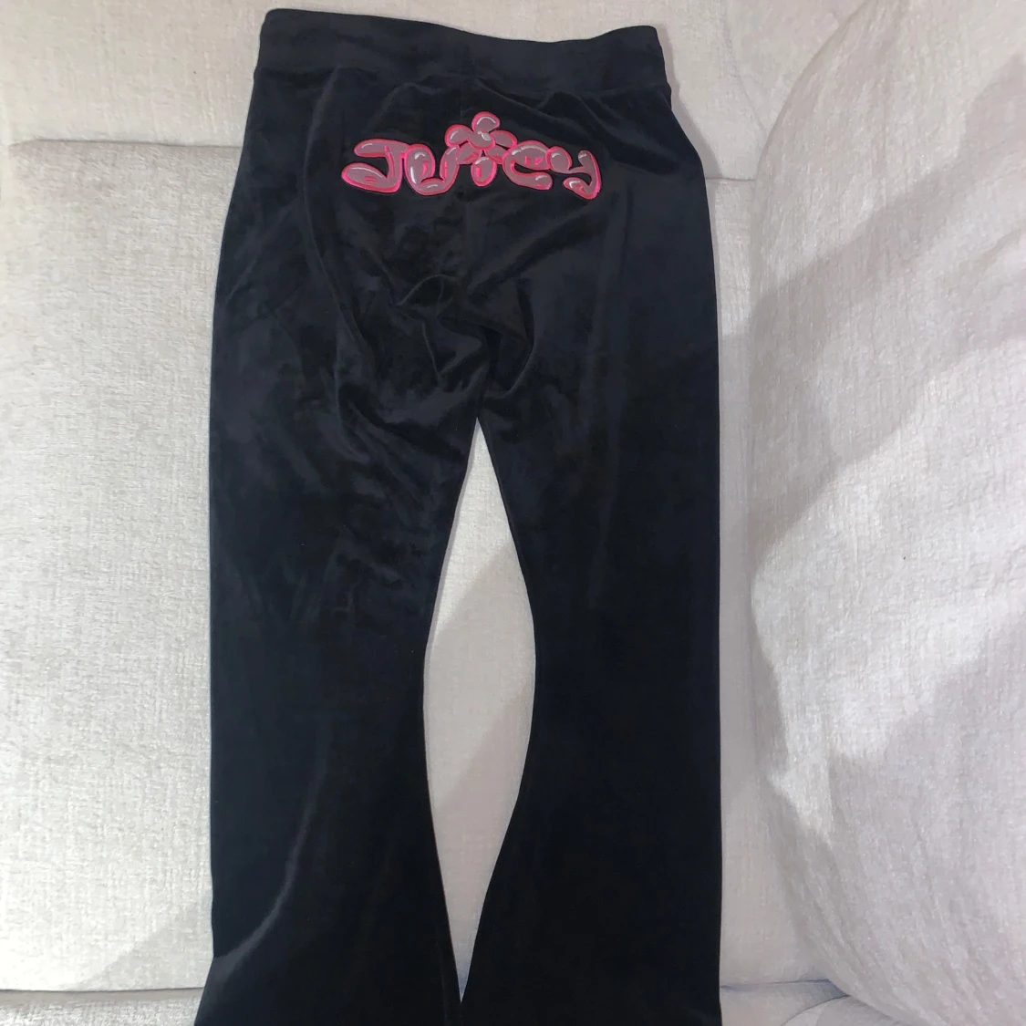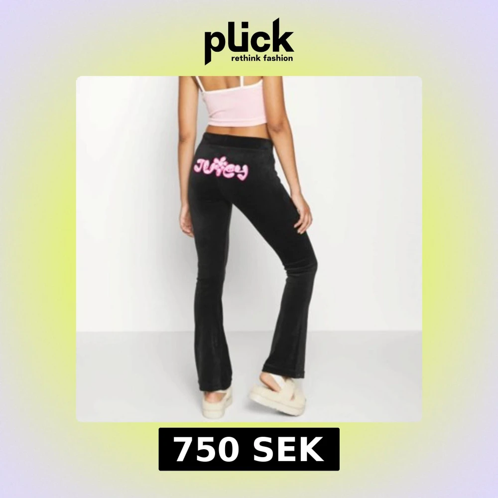 Aldrig använda svarta velourbyxor från Juicy Couture med rosa broderad bubbel logga på baksidan och framtill. Byxorna har en bekväm passform med snörning i midjan och är perfekta för en avslappnad stil. Mycket svåra att få tag i svart på nätet.
