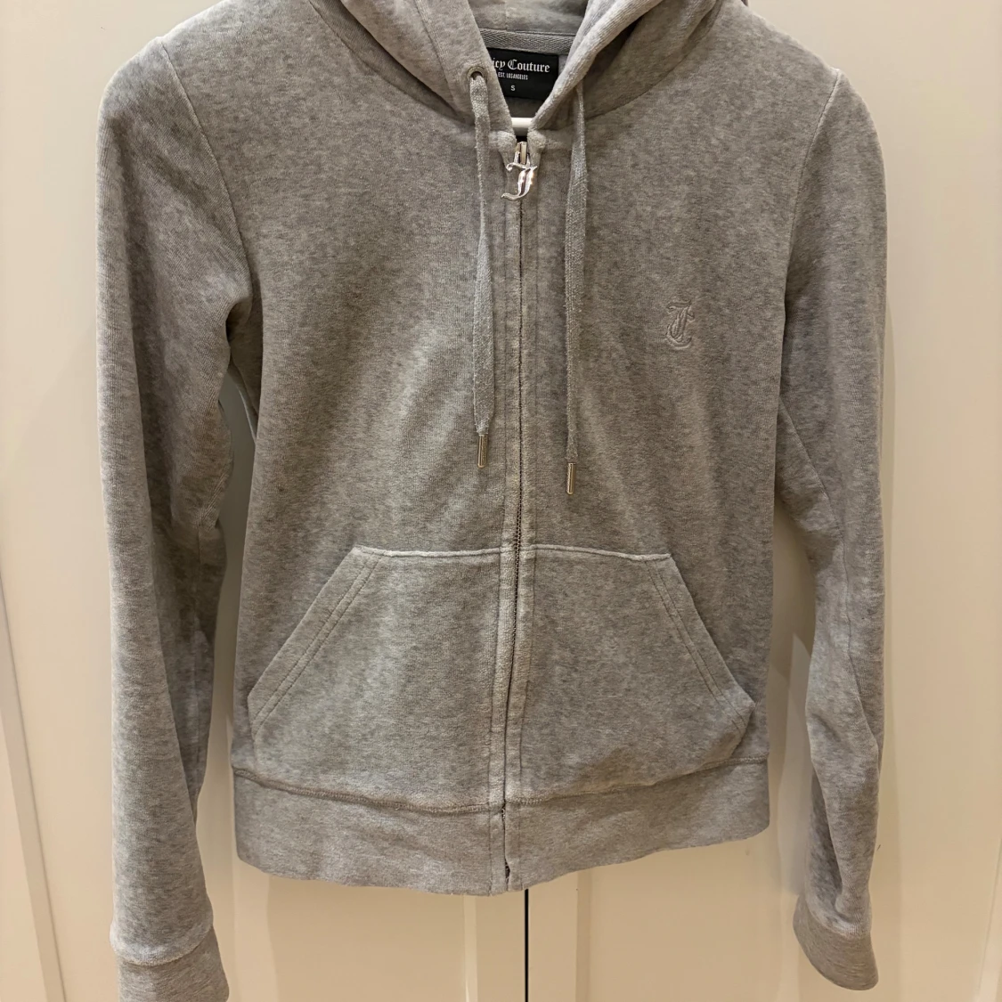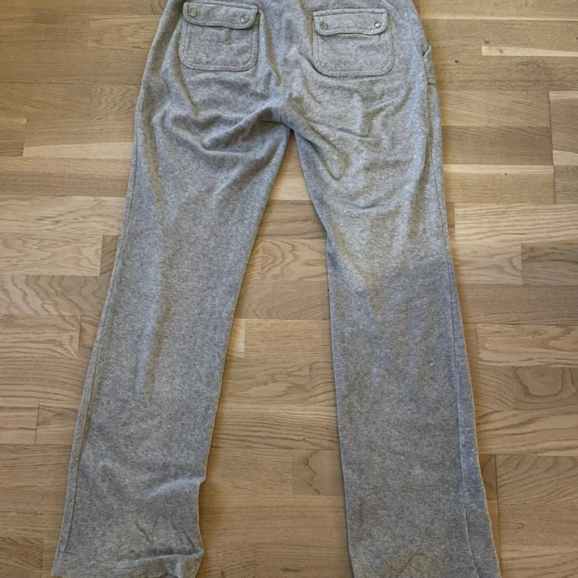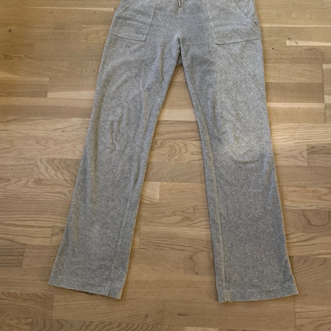 Grå mjukisbyxor/hoodie från Juicy Couture i storlek S. Byxorna har raka ben, framfickor och bakfickor med knappdetalj. Dem är lite slitna längst ner, då dom vart för långa på mig.Tillverkade i mjukt material som är perfekt för en chill look. Klassisk Juicy Couture-stil med diskret logga.