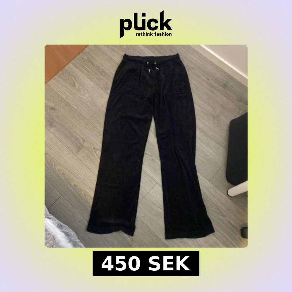 Säljer ett par svarta mjukisbyxor med snörning i midjan. Byxorna har en loose passform och är perfekta för en avslappnad stil. De har fickor både fram och bak, vilket ger en praktisk touch.