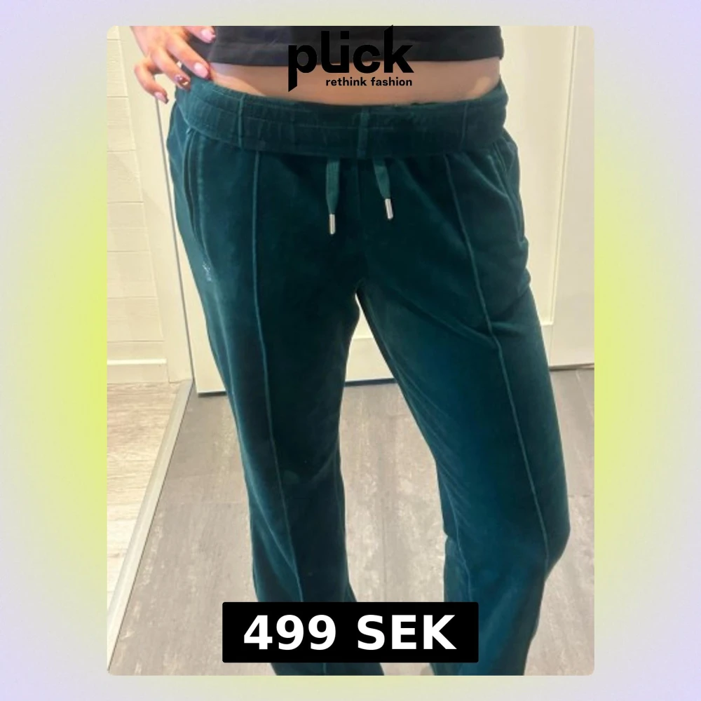 Säljer ett par mörkgröna mjukisbyxor från Juicy Couture i mjuk sammet med strassdetaljer. Byxorna har snörning i midjan, raka ben och Juicy-logga i strass på baksidan samt ett litet emblem framtill. Perfekt för dig som gillar glam och comfy vibes.