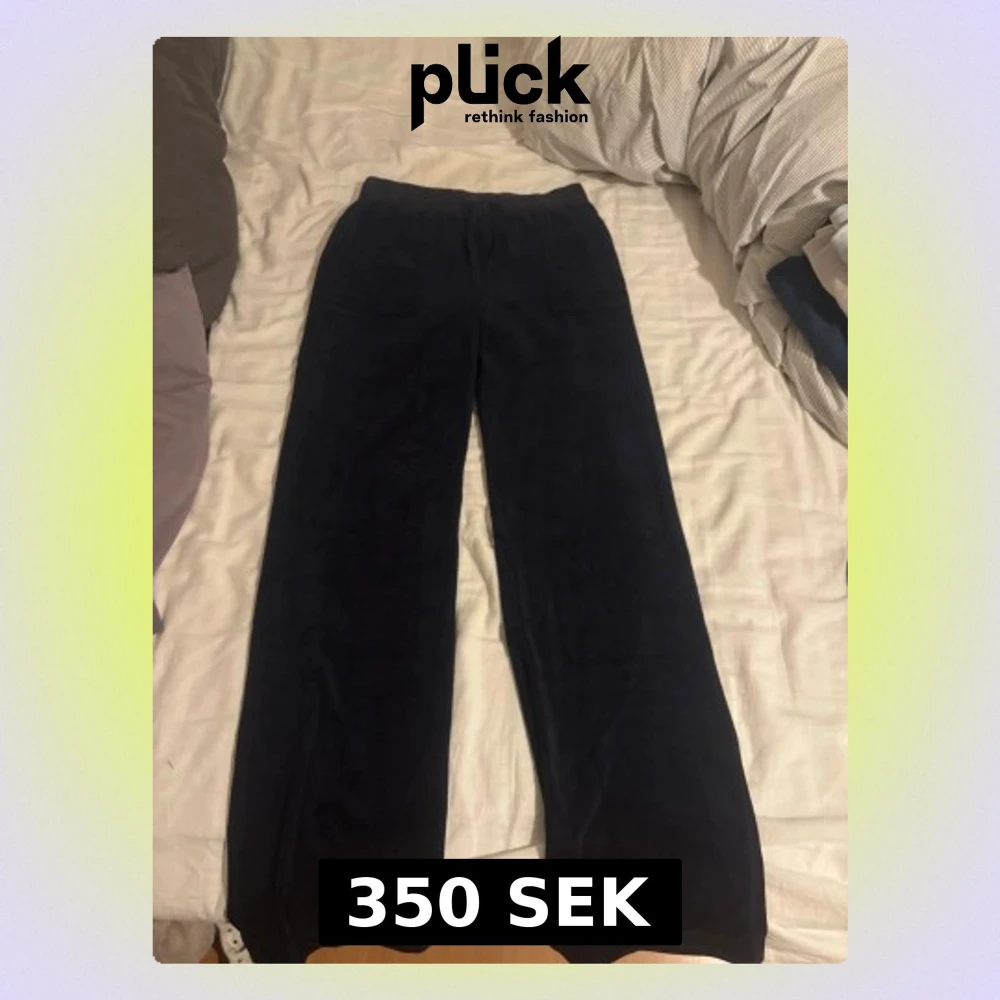Säljer mina mörkblå mjukisbyxor från Juicy Couture i storlek S. Byxorna har bred resår i midjan, raka ben och fickor både fram och bak med knappdetaljer. Tyget runt ena knappen där bak har lossnat men inget man lägger märke till på håll.