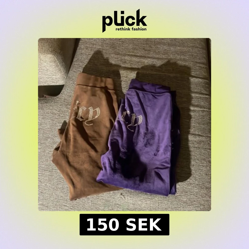 Två par ikoniska Juicy Couture mjukisbyxor i storlek S, ett par i chokladbrunt och ett par i lila. Båda har glittrande strasstexten 'juicy' på höften och är gjorda i mjuk, skön velour. Perfekta för en chill och trendig look. Jag tar 150 för båda!