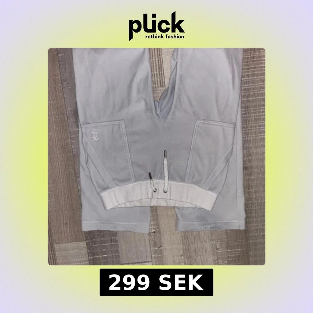 Säljer ett par ljusgrå mjukisbyxor från Juicy Couture med bred resår och snörning i midjan. Byxorna har stora fickor fram, en ficka med knappar på benet och broderad JC-logga. Perfekta för chill dagar eller när du vill vara extra comfy.