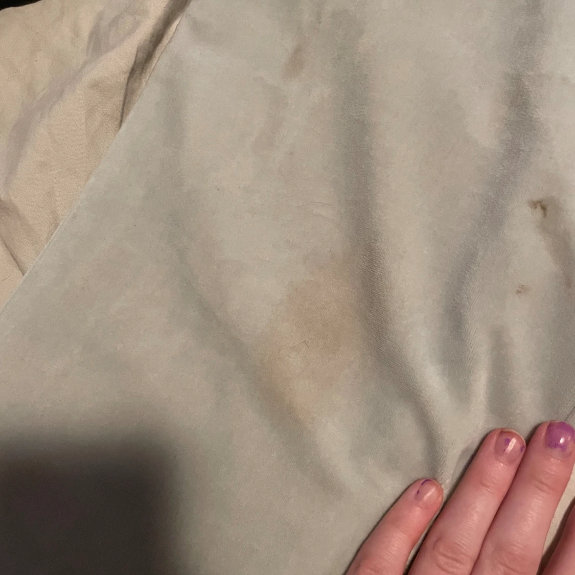 Dem är missfärgade och fläckar, har aldrig testat tvätta med olika medel för att få bort det. Fläckarna beror på priset. Skriv gör frågor ❤️