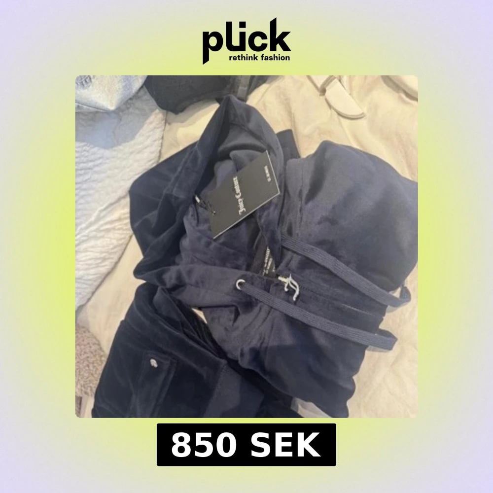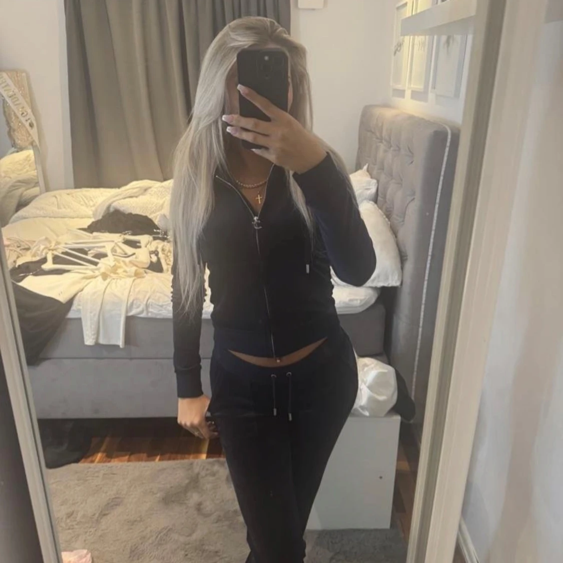 Mysiga mörkblå velourbyxor från Juicy Couture.Använt endast en gång , helt som nya, prislapparna är av men finns kvar då jag köpte dressen nyss. Tröjan är storlek xxs men sitter som xs/s o byxorna är xs men sitter som en s också. Jag är 165 lång o dem går ner till marken för mig, då de inte kommer att komma till användning säljer jag de billigt