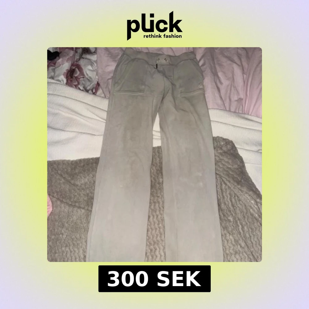 Vita juicy couture byxor. Använda väldigt mycket förut. Färgen är lite urtvättad så färgen ser lite grå ut. Små fläckar som ni ser på bilderna och en metall på snöret har åkt av.