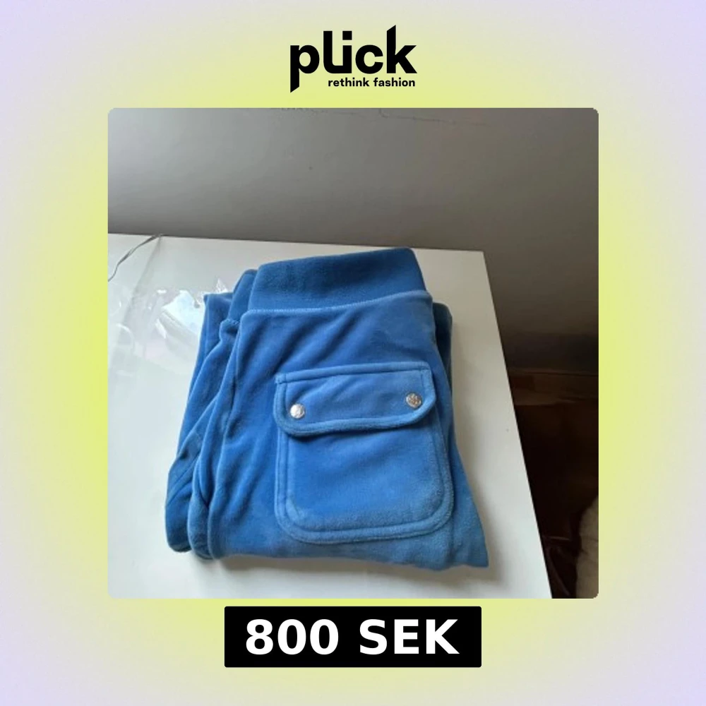 Blå mjukisbyxor från Juicy Couture i supermjuk velour med bred resår i midjan, fickor med lock och silverfärgade knappar bak samt broderad JC-logga framtill. Perfekta för en chill och trendig look.