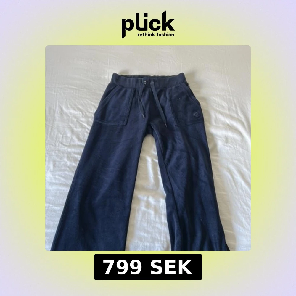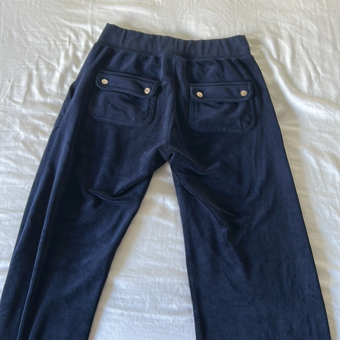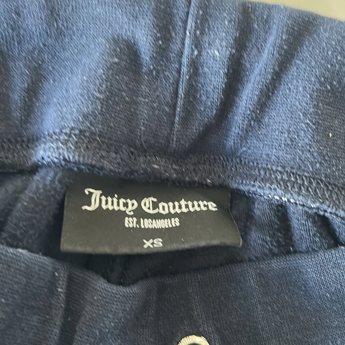Mörkblå mjukisbyxor från Juicy Couture med snörning i midjan, två stora fickor fram och bakfickor med knappar. Byxorna är i mjukt material och har en avslappnad passform, perfekta för chill dagar.