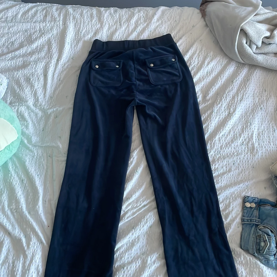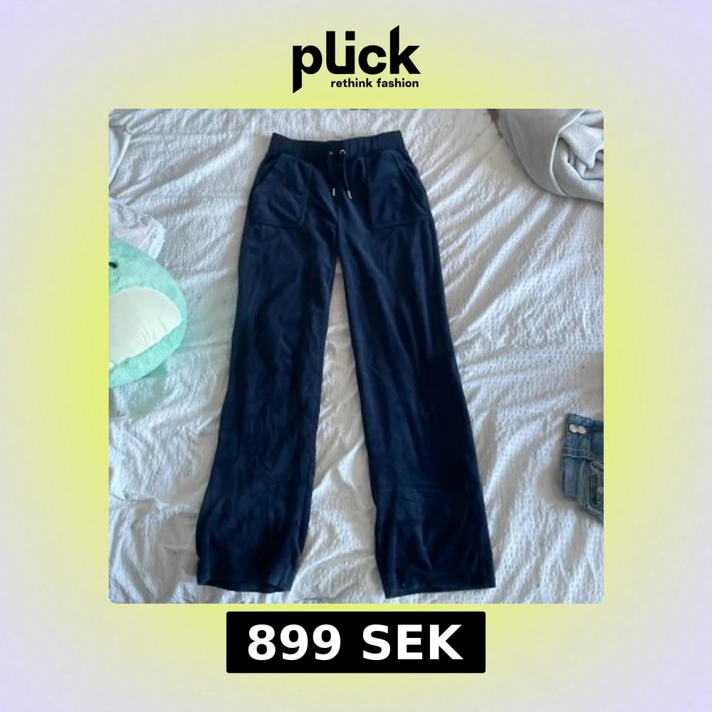 Säljer ett par mörkblå mjukisbyxor från Juicy Couture i storlek S. Byxorna har en bekväm passform med dragsko i midjan och fickor både fram och bak. Perfekta för en avslappnad stil. Pris kan diskuteras!!!