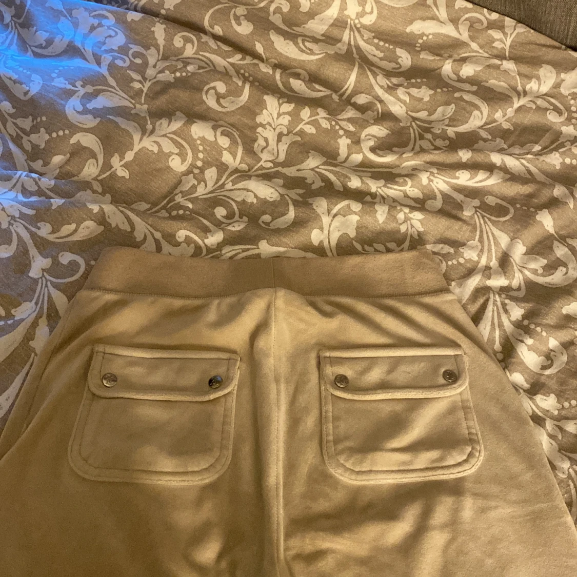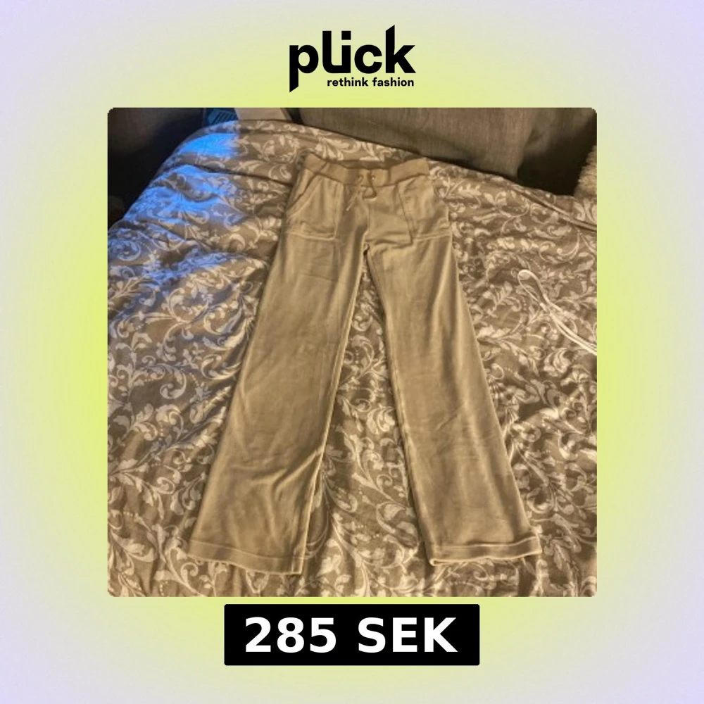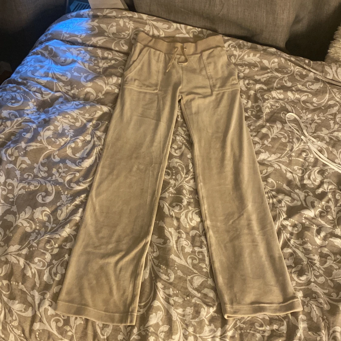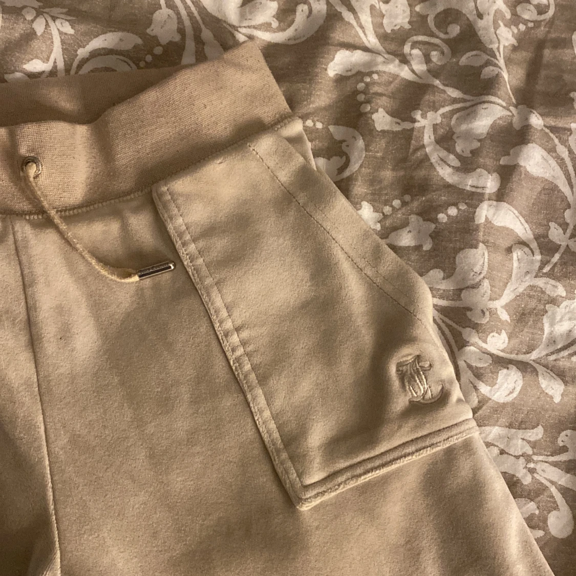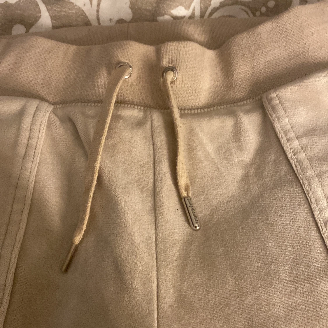 Ett par beige juicy Conture byxor. Dom är i storlek XS. Allting är i bra skick förutom att det är en silvrig metall sak som ska sitta på snören som ni kan se på bilden. Det finns också en liten liten fläck som ni kan se på sista bilden men den är inte så synlig men går säkert bort i tvätten om man skrubbar. Annars fin skick köpta för 1000kr!❤️