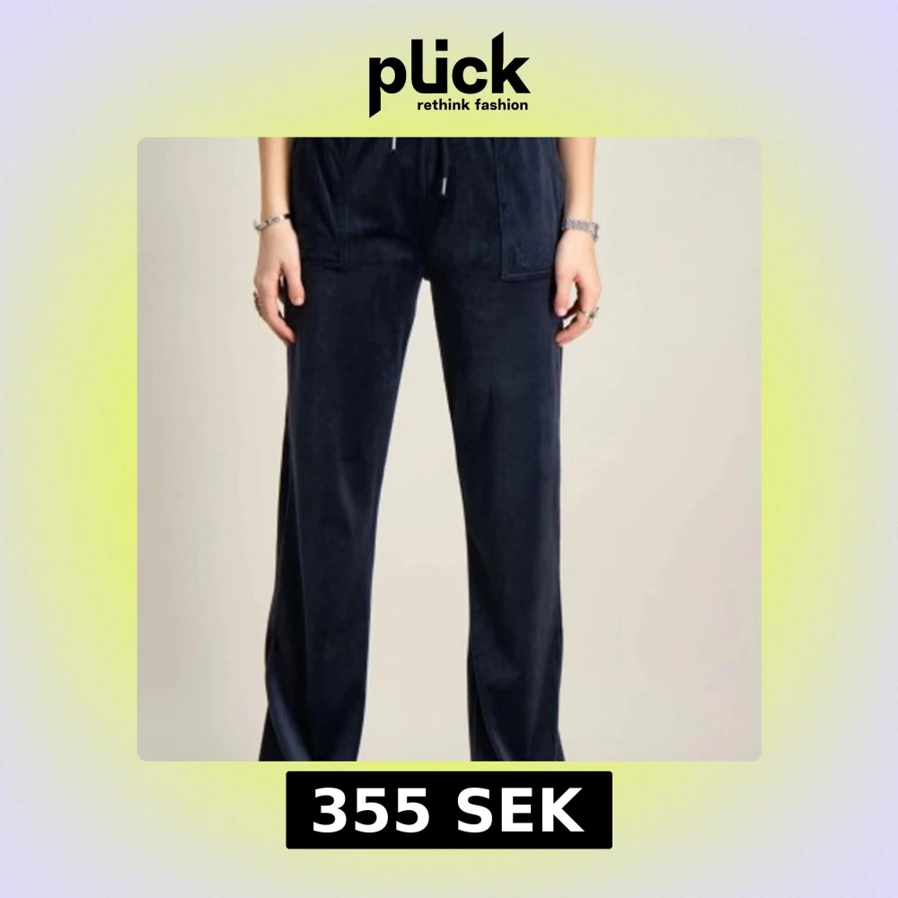 Mörkblå velourbyxor från Juicy Couture med raka ben och dragsko i midjan. Byxorna har bakfickor med knapp och stora fickor fram. Perfekta för en chill och trendig look. Lite slitna nere vid hälarna! Ny pris 1200kr❣️