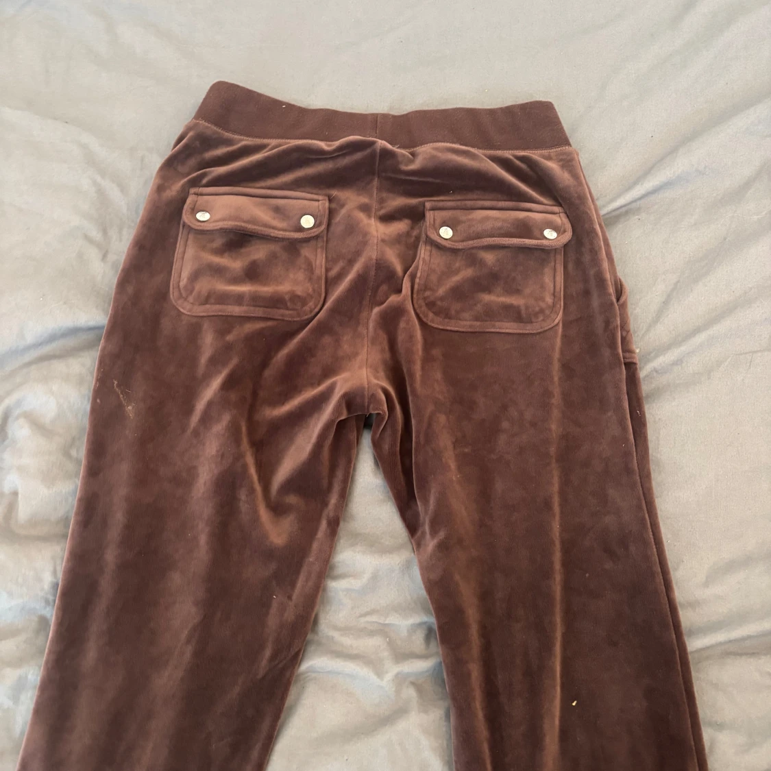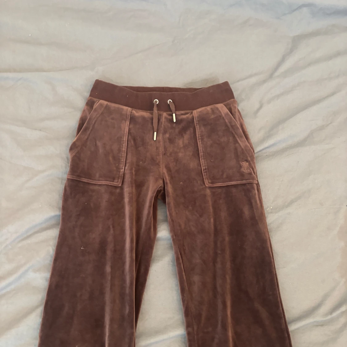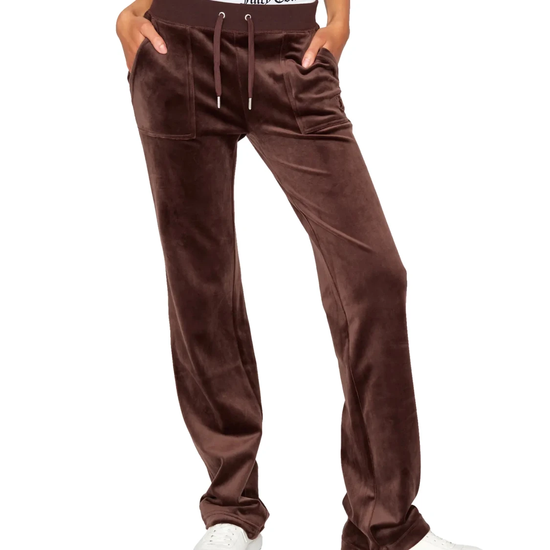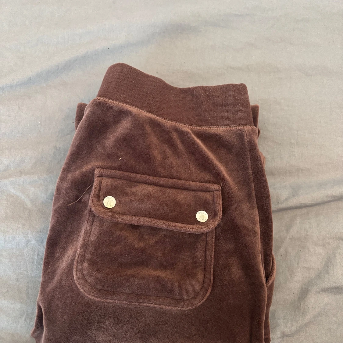 Snygga bruna mjukisbyxor från Juicy Couture i mjuk velour med bred resårmidja och snörning framtill. Byxorna har raka ben, stora fickor både fram och bak med silverfärgade knappar. Perfekta för chill eller streetwear.