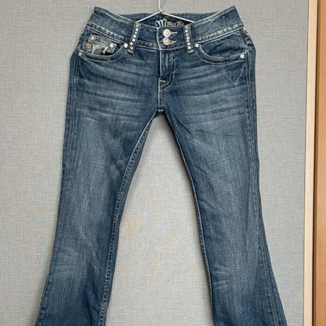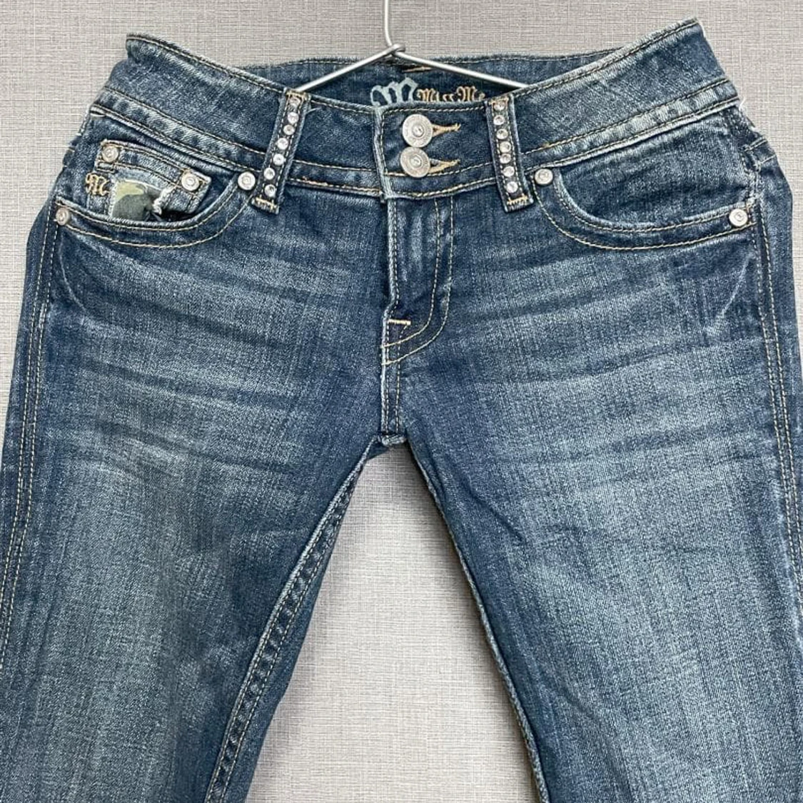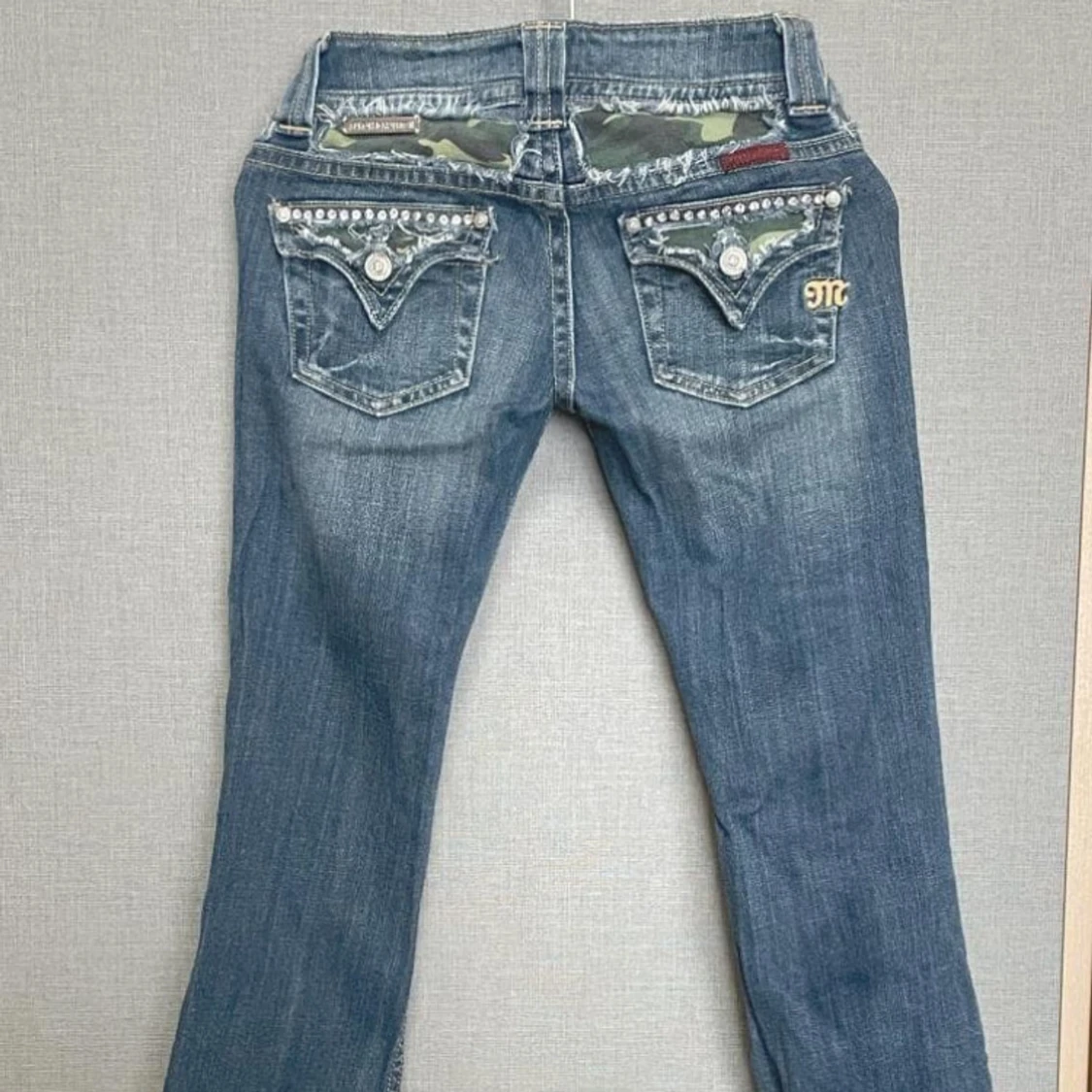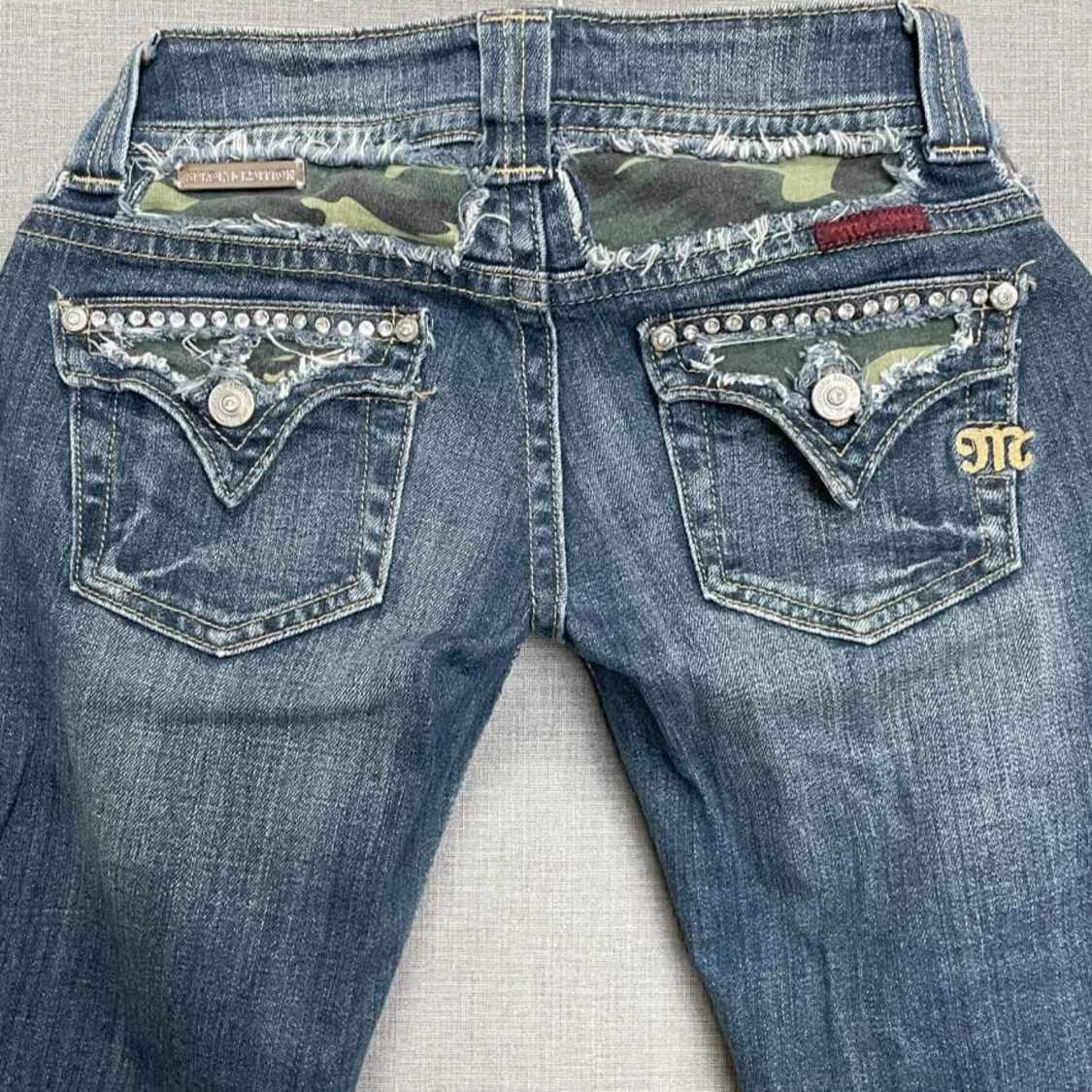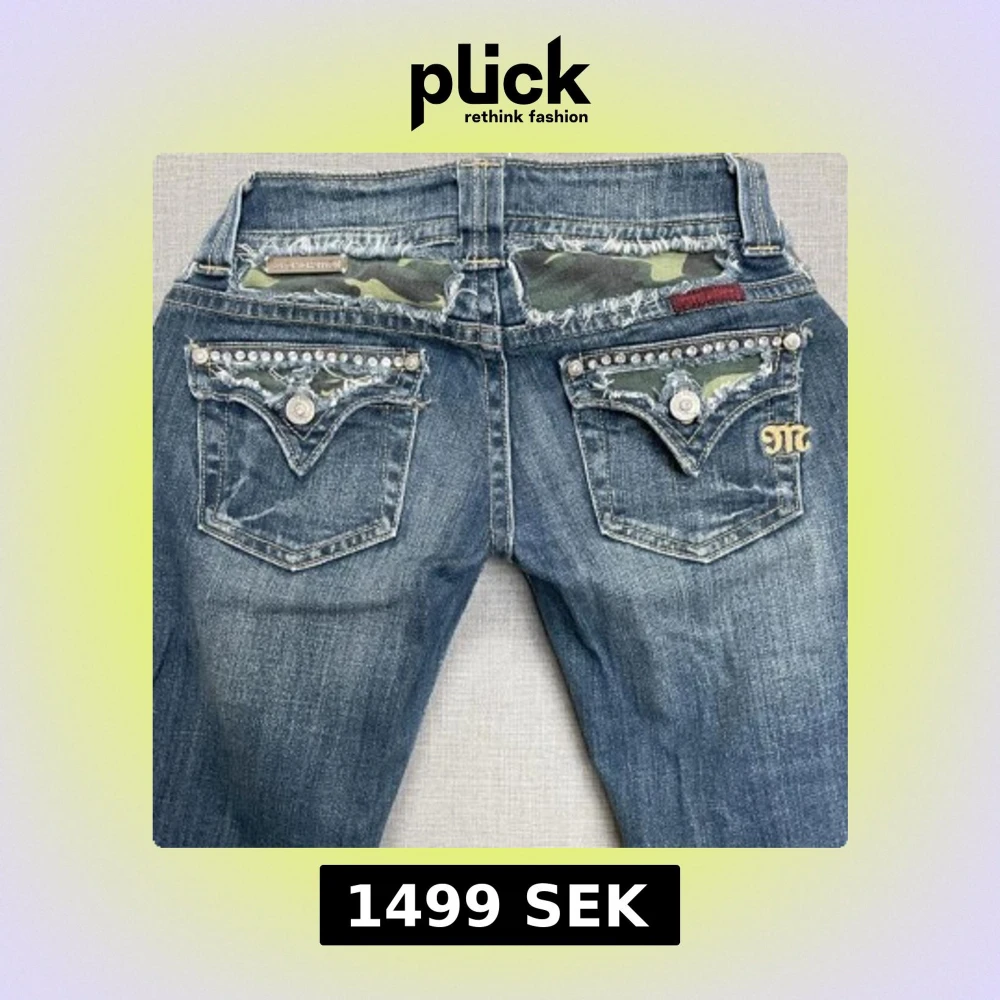 Snygga blå jeans från Miss Me med camouflage-detaljer på fickorna, nitar och strass. Jeansen har bootcut-modell och är special edition. Storlek S, ge gärna prisförslag💞