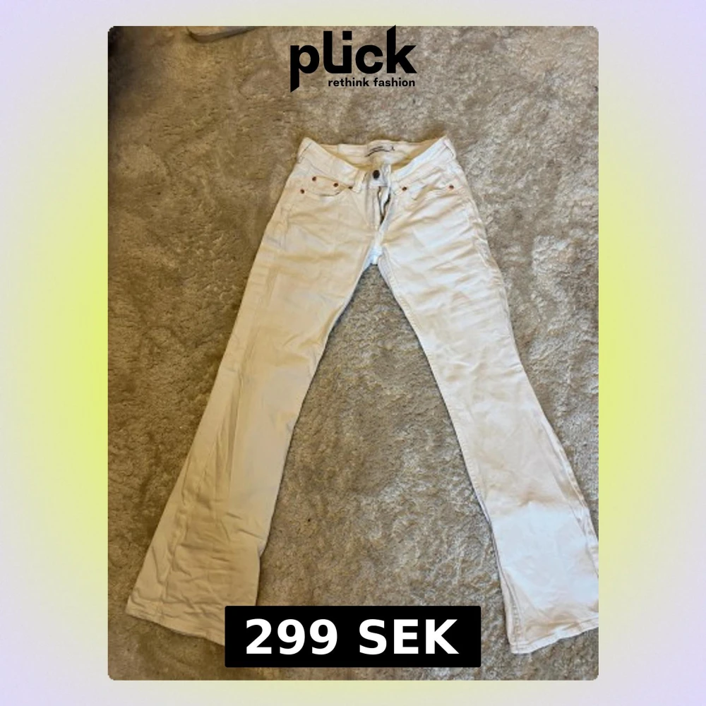 Säljer ett par vita jeans från Junkyard med klassisk femficksdesign och snygg bootcut-passform. Byxorna har låg midja och är tillverkade i mjukt bomullsmaterial med en lätt stretch. Perfekta för dig som gillar en clean och fräsch look.