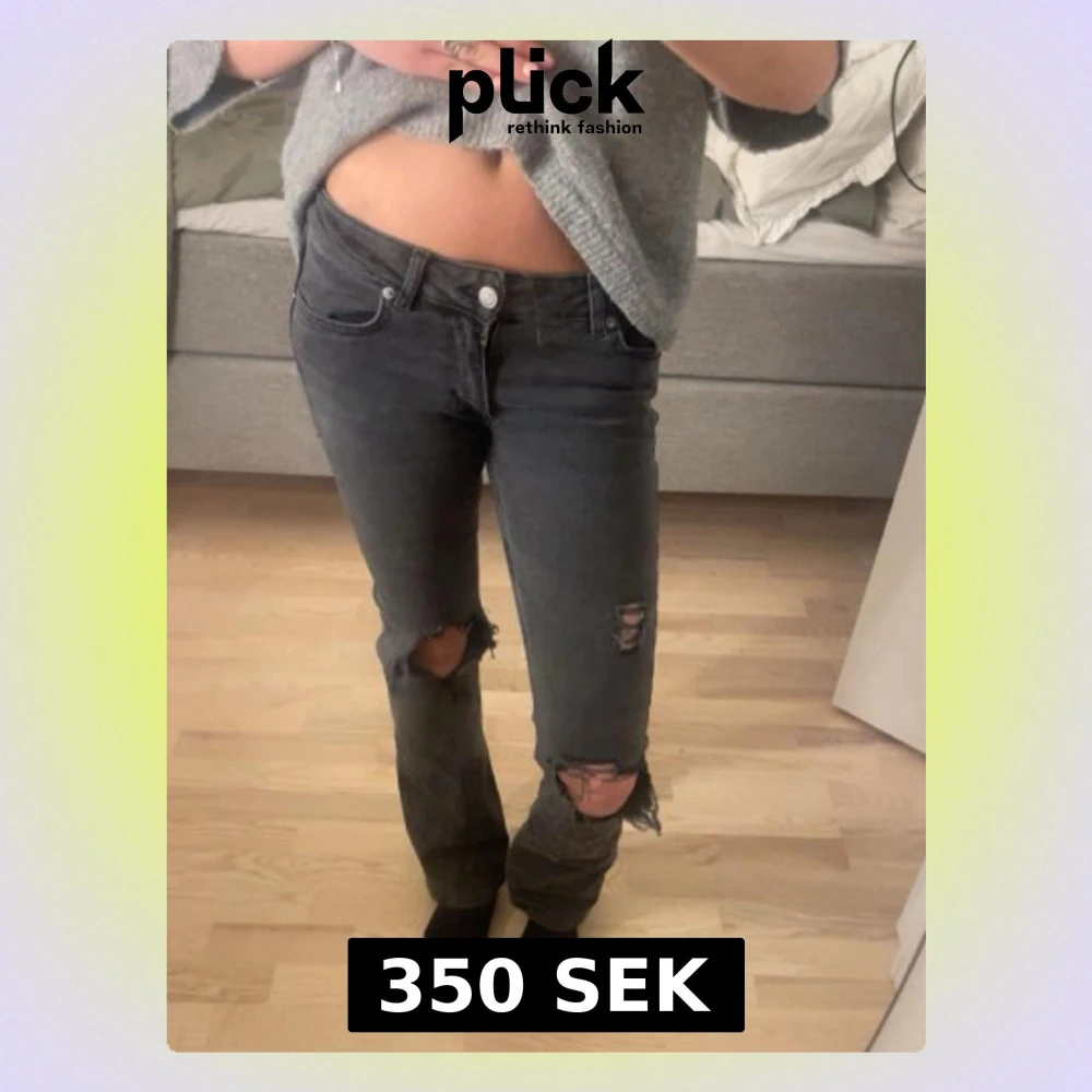 Svarta jeans från Junkyard i storlek XS, low waist bootcut med egen gjorda hål. På sista bilden kan man se att sömnen gått upp lite på änden av ena byxbenet.