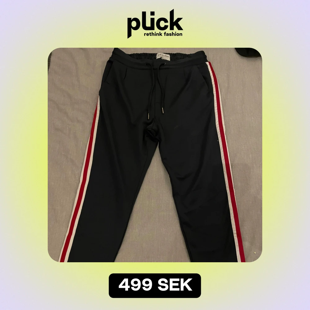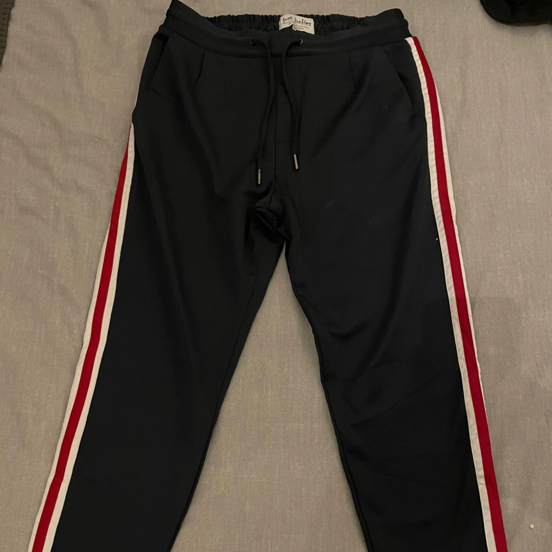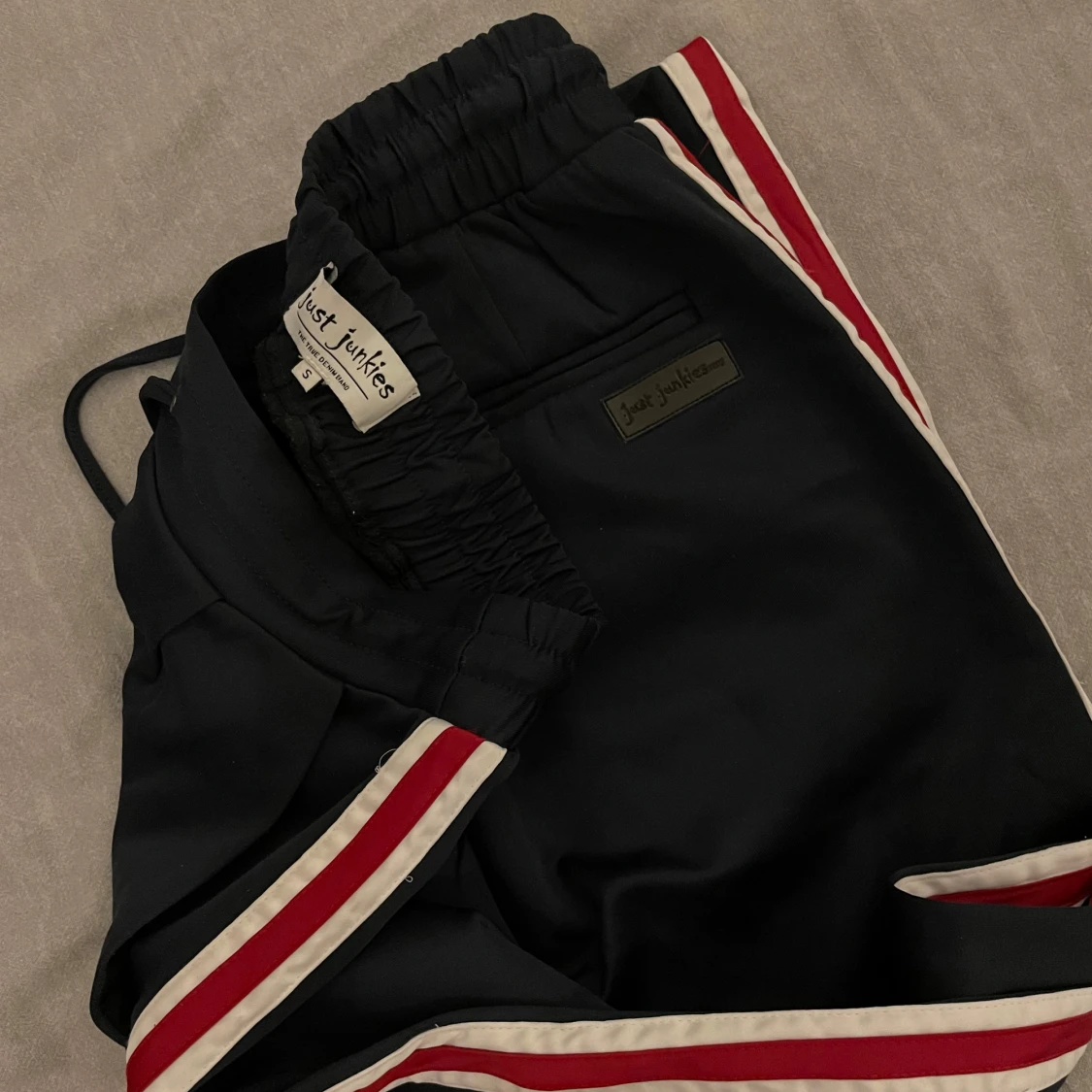 Otroligt sköna samt snygga brallor från Just Junkies i storlek S, fint skick. En tidlös marinblå färg med vit/röda streck längs med hela sidorna som gör att byxorna verkligen poppar ut i verkligheten och funkar med allt till alla sammanhang! Ett plagg alla borde ha i garderoben🙌🏻