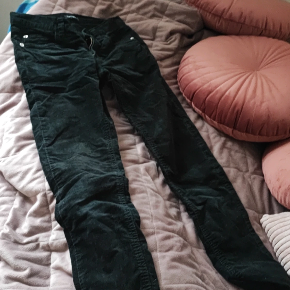 Jätte fina jeans. Det är lågmidjade. Jag har aldrig använt det. Materialet är lent på det. Det är i bra skick. Det är små i storlek.