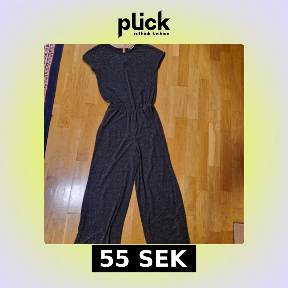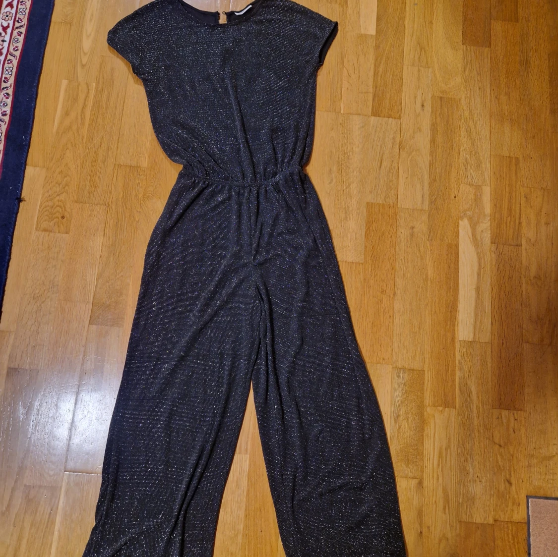 Snygg svart byxdress från KappAhl med glittriga detaljer. Vida ben och resår i midjan ger en avslappnad men cool look. Materialet är mjukt och stretchigt. Rund halsringning och korta ärmar med en knapp bak.