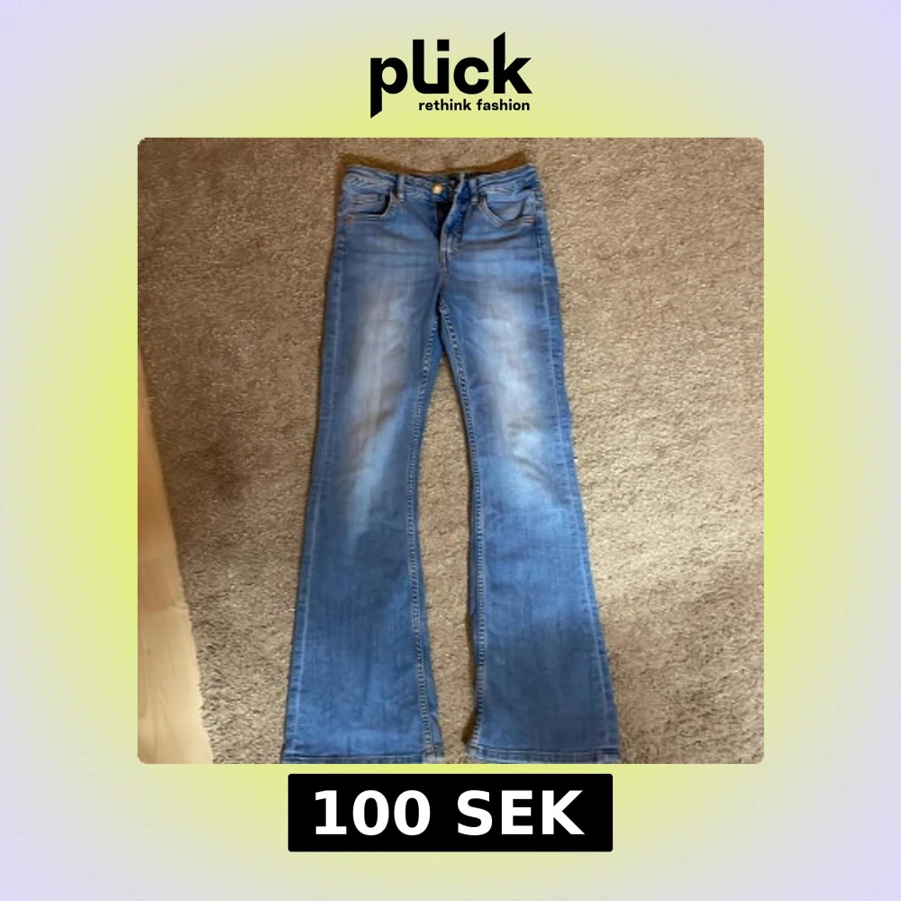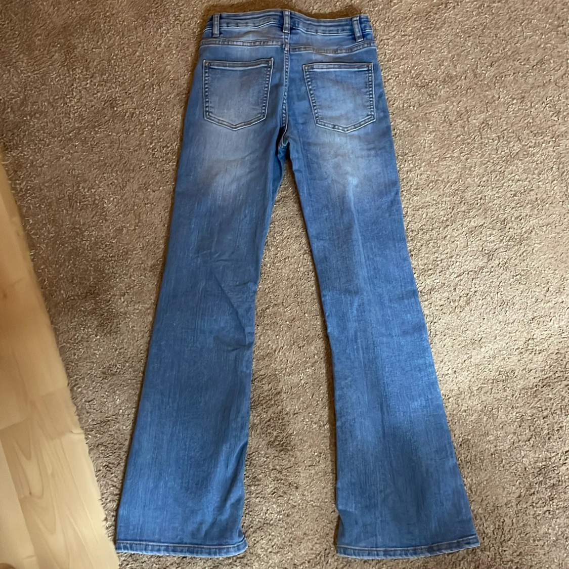 Snygga blå jeans från Kappahl i storlek 152. Jeansen har klassisk femficksdesign, bootcut-ben och ljus tvätt med lätt slitning framtill. Perfekta för dig som gillar en retroinspirerad look med utsvängda ben.