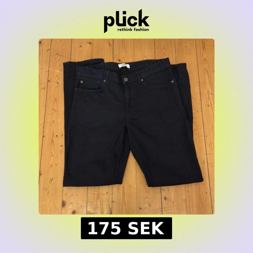 Säljer ett par svarta jeansbyxor från Kappahl med klassisk femficksdesign och normal passform. Byxorna har knapp och dragkedja i gylfen samt bälteshällor. Perfekta till vardags för en stilren look.