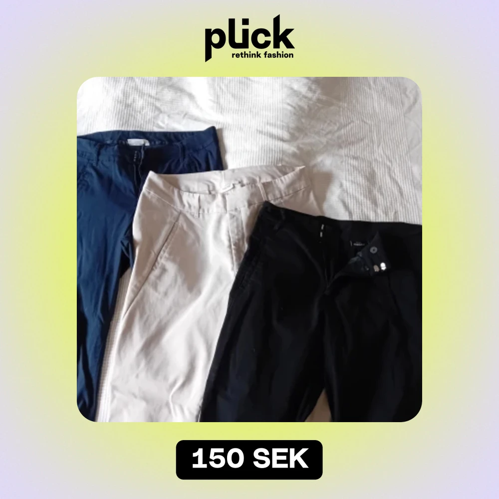 Tre byxor, bomull/polyester, vit, blå, svart. Alla för 150kr. Hundar finns i hemmet.