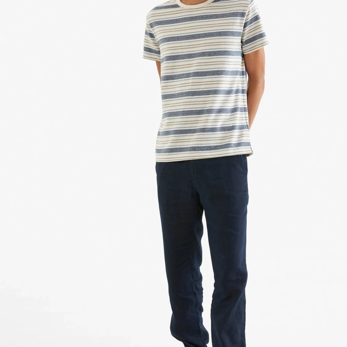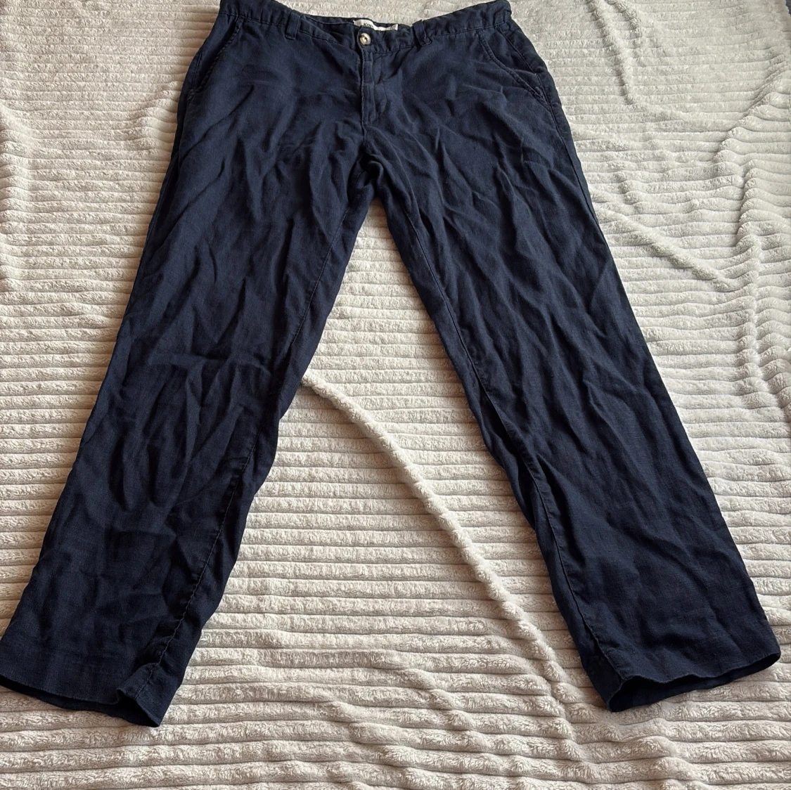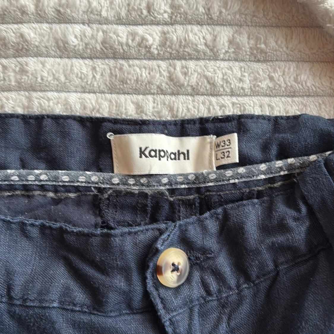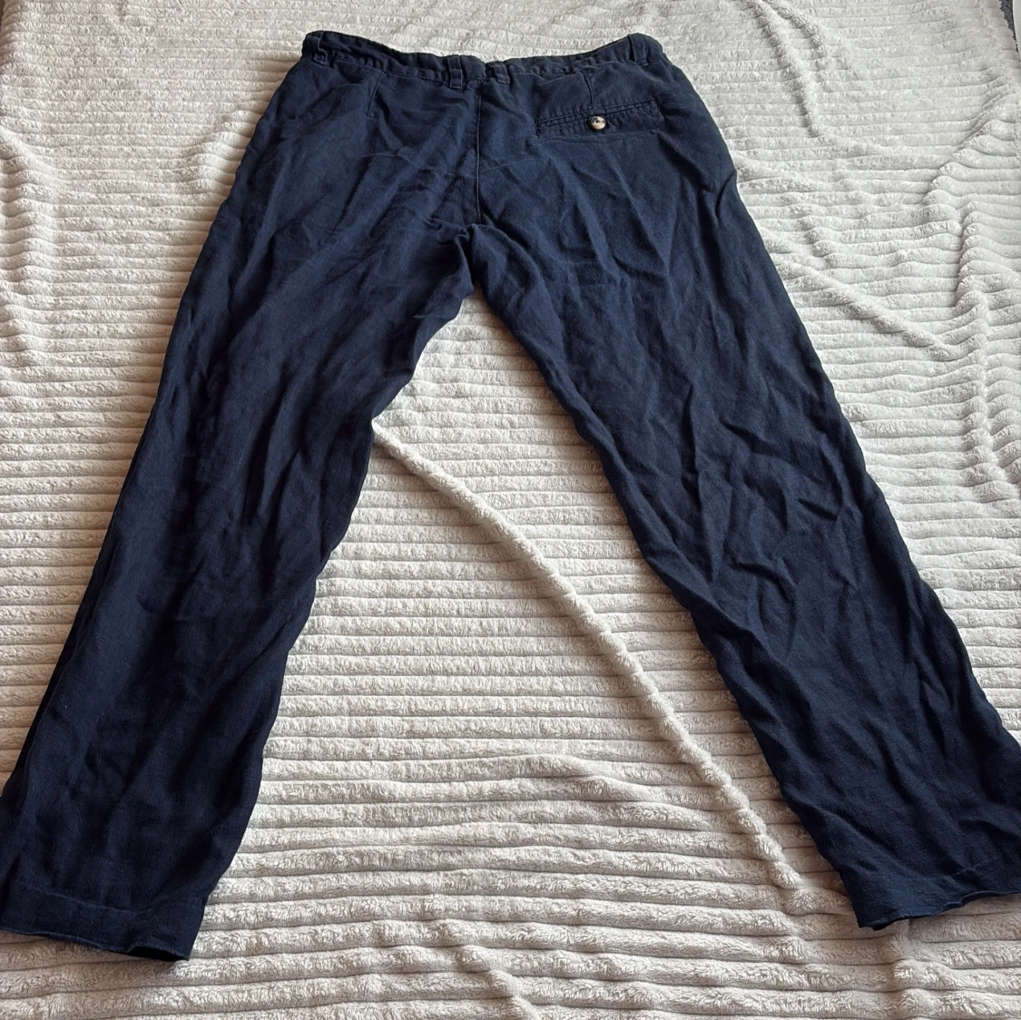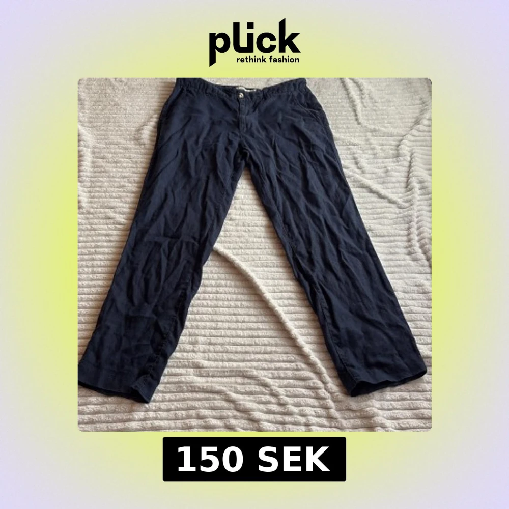 Säljer ett par mörkblå byxor från Kappahl i linne. Byxorna har normal passform, raka ben och klassisk midja med knapp och dragkedja. Perfekta för en avslappnad stil och passar perfekt till sommaren.