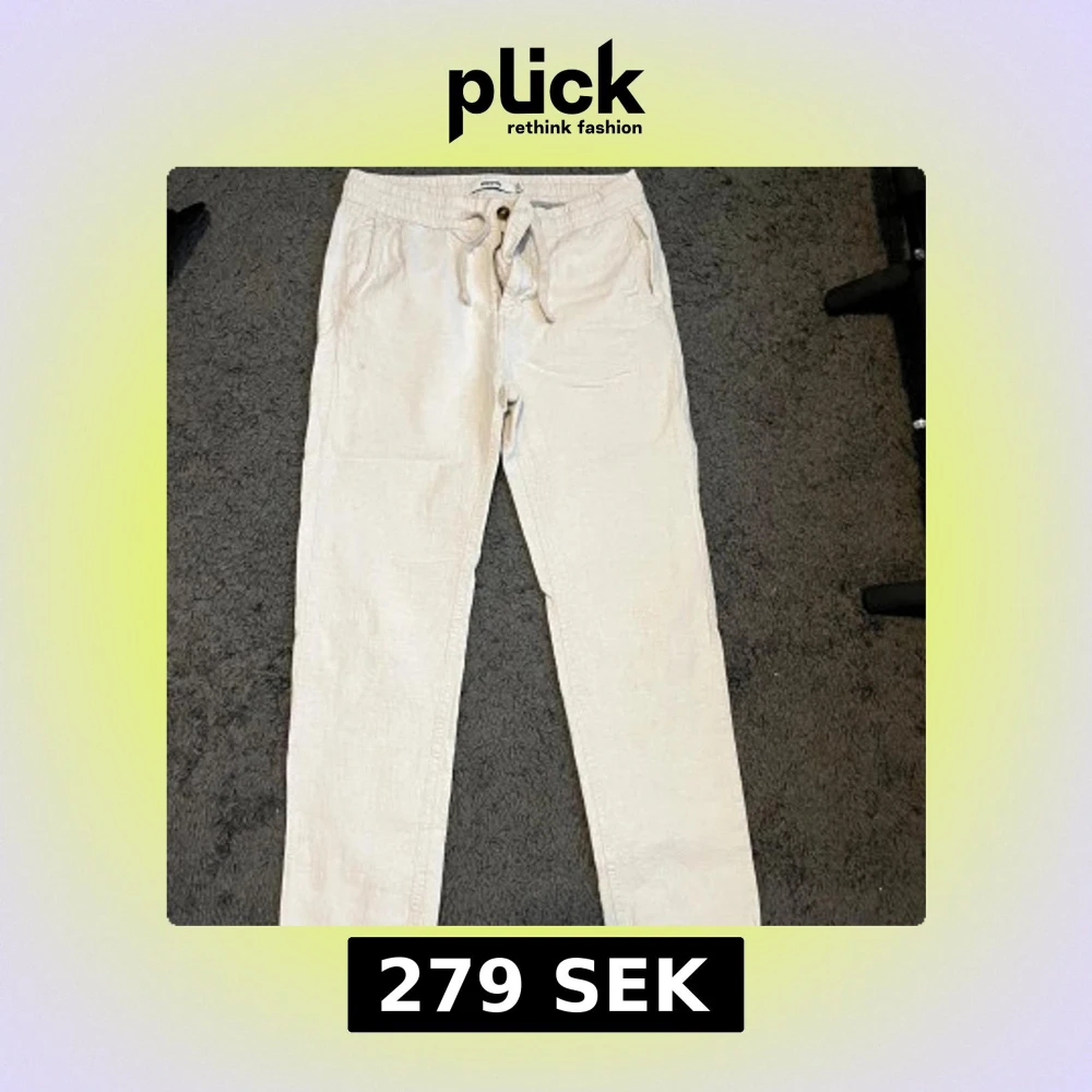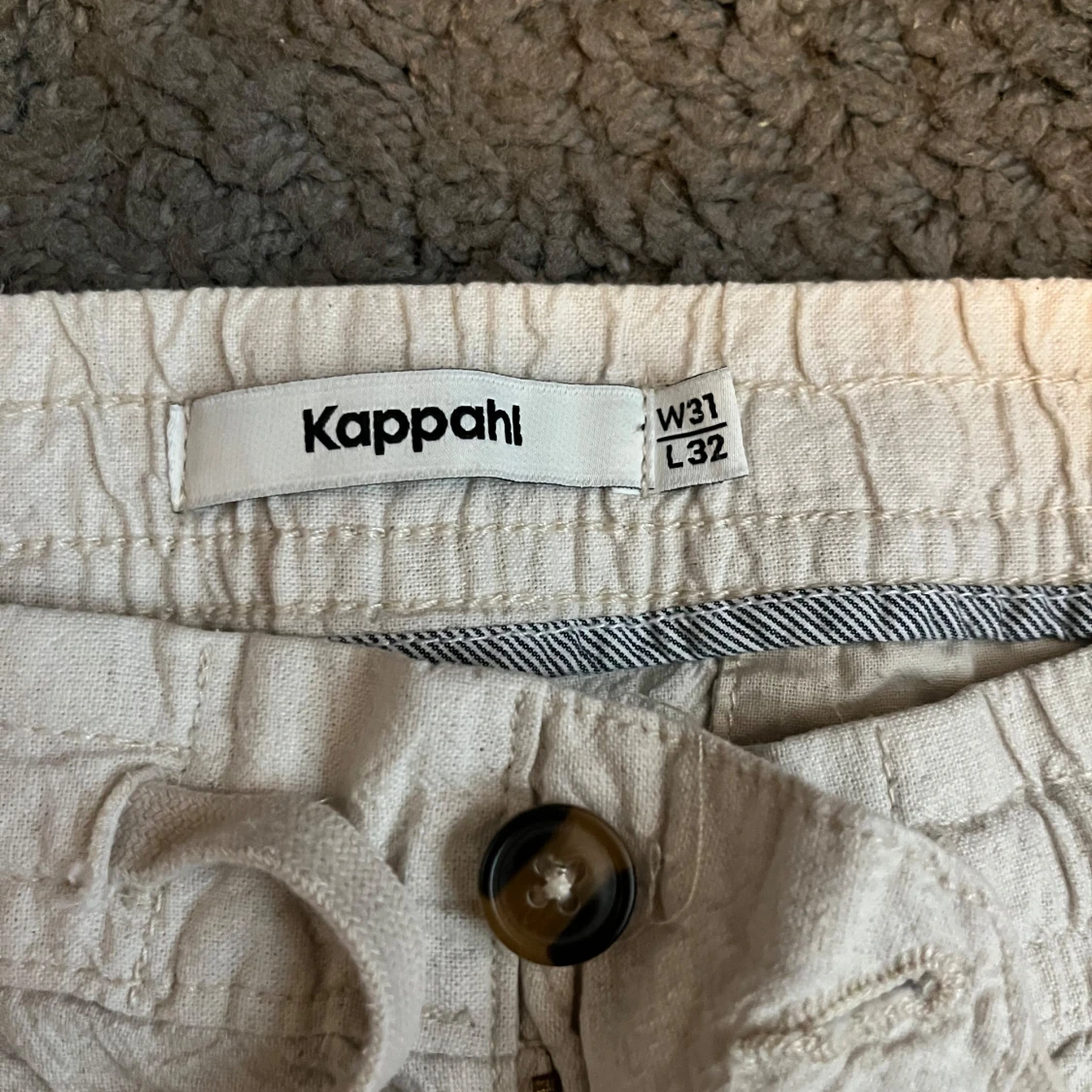 Snygga beige linnebyxor från Kappahl med avslappnad passform och dragsko i midjan. Byxorna har fickor på sidorna och knappstängning framtill. Perfekta för chill dagar och sommarhäng, riktigt sköna och luftiga.