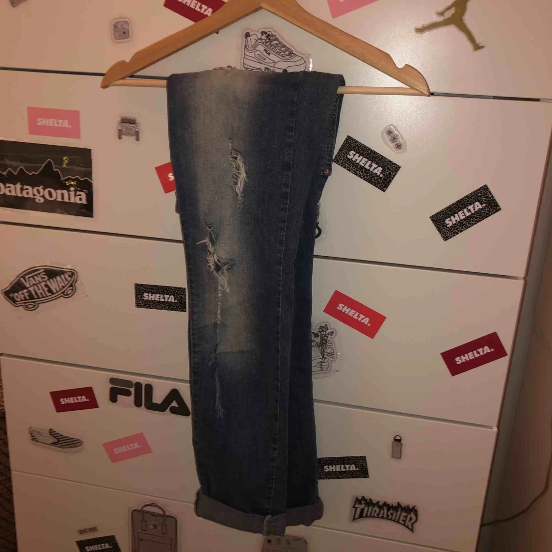 Ett par fina jeans från Kappahl i storlek 34 med pärlor på (se bild 2), pärlorna sitter ganska nära midjan och vid fickorna vid midjan. Köpta på second hand men är i gott skick💕