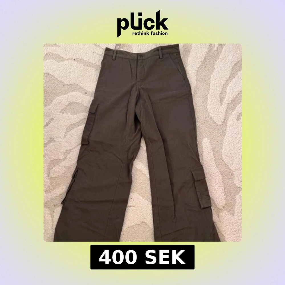 Säljer ett par khaki cargopants med flera praktiska fickor på sidorna. Byxorna har en normal passform och är perfekta för en avslappnad stil. De har bälteshällor och stängs med knapp och dragkedja. Jag har aldrig haft på mig dom - tag kvar.
