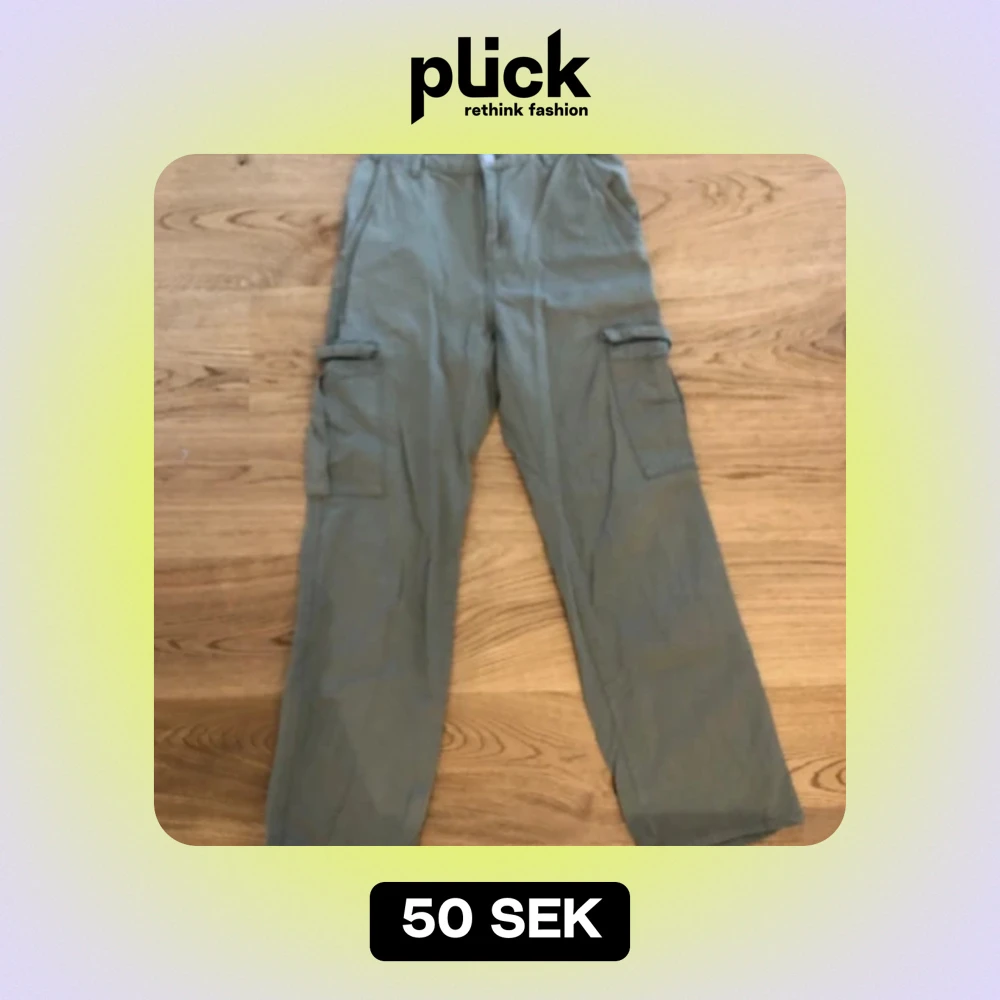 Cargobyxor i rak modell. Normal midja. Storlek 38. Väl använda men i ok/bra skick. Finns en liten svart fläck på insidan av det ena byxbenet. Detta syns knappt när man har de på sig.
