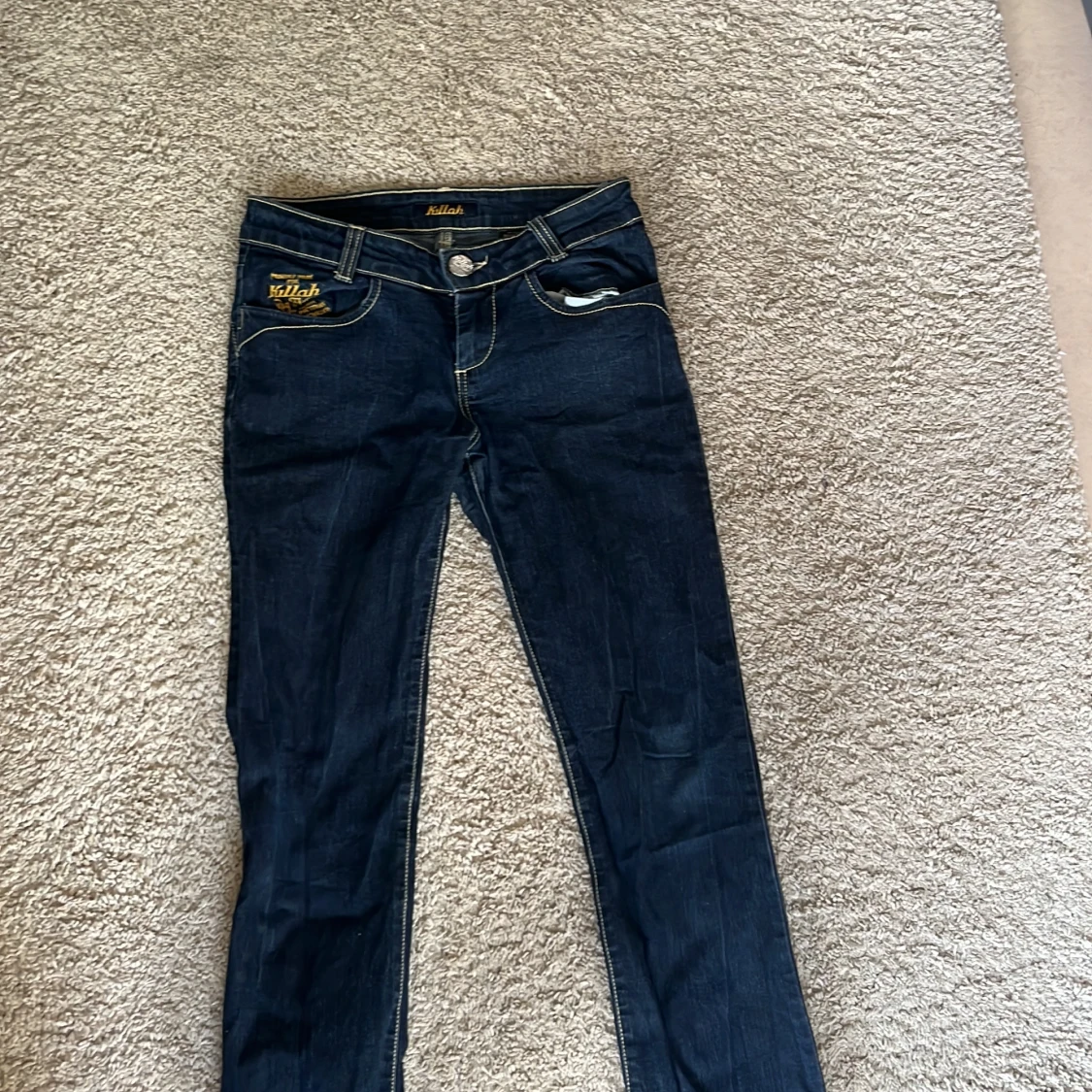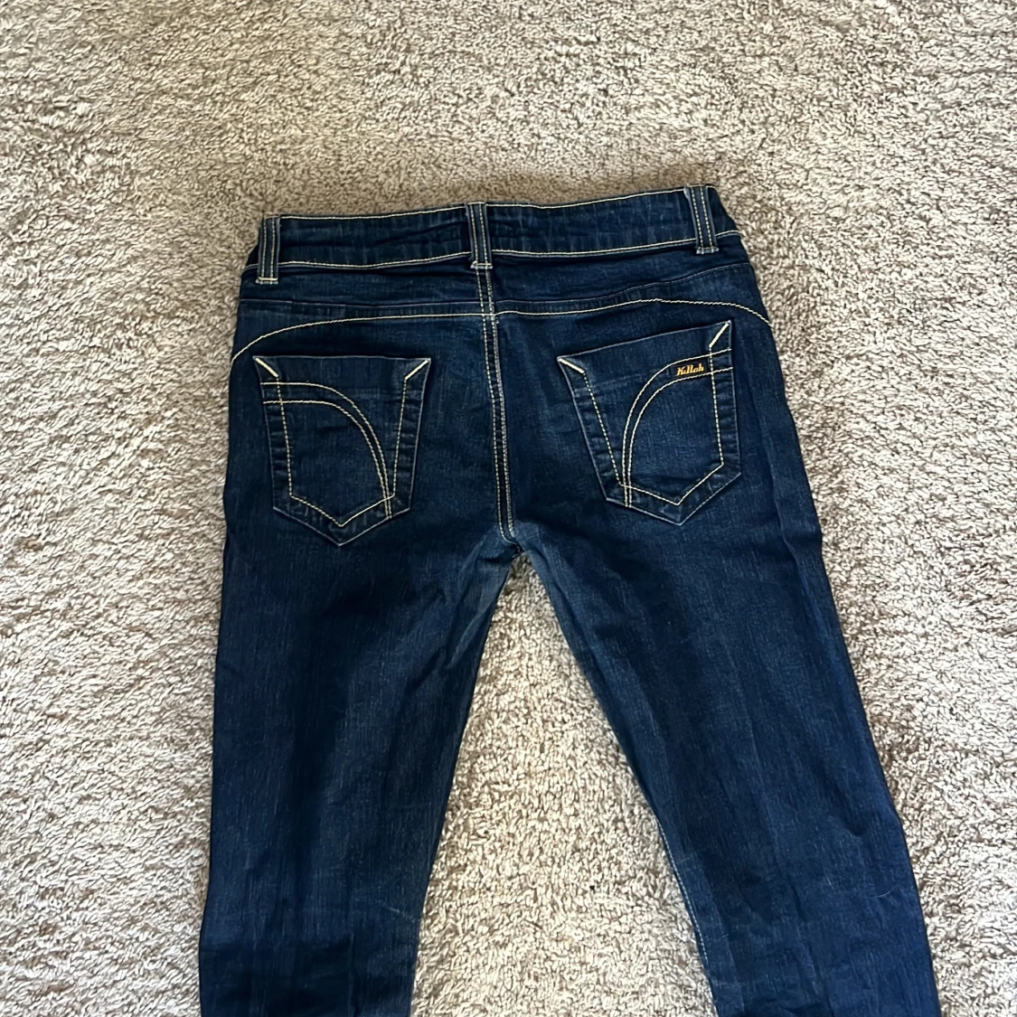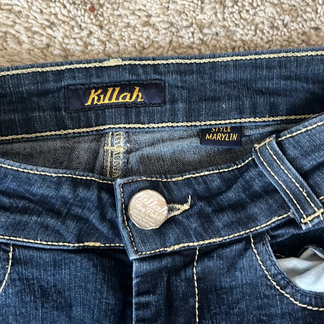Mörkblå jeans från Killah, modell Marylin, med kontrasterande gula sömmar och snygga detaljer på fickorna. Sitter väldigt fint och lågmidjat på, passar mig som brukar ha strl S i byxor. De går ut lite i slutet av jeansen 💓💓köpt second hand 400 kronor