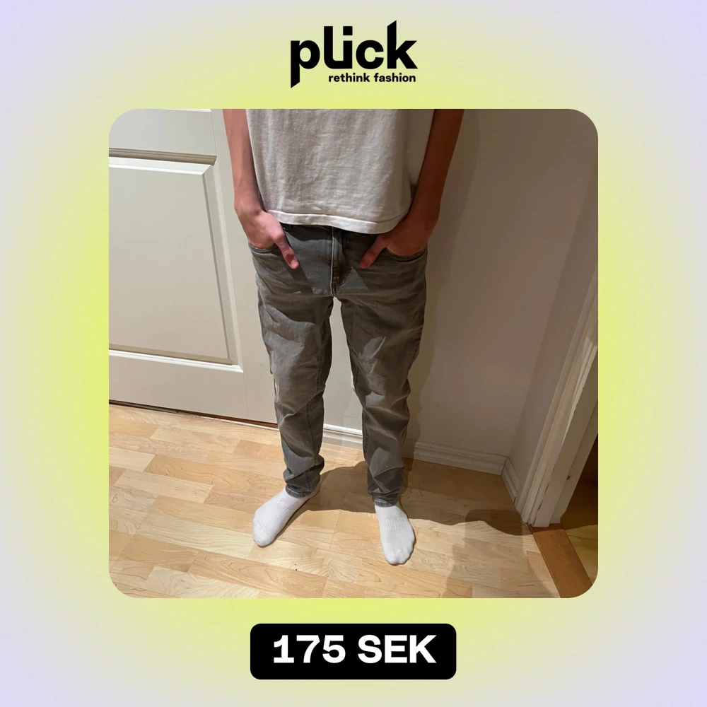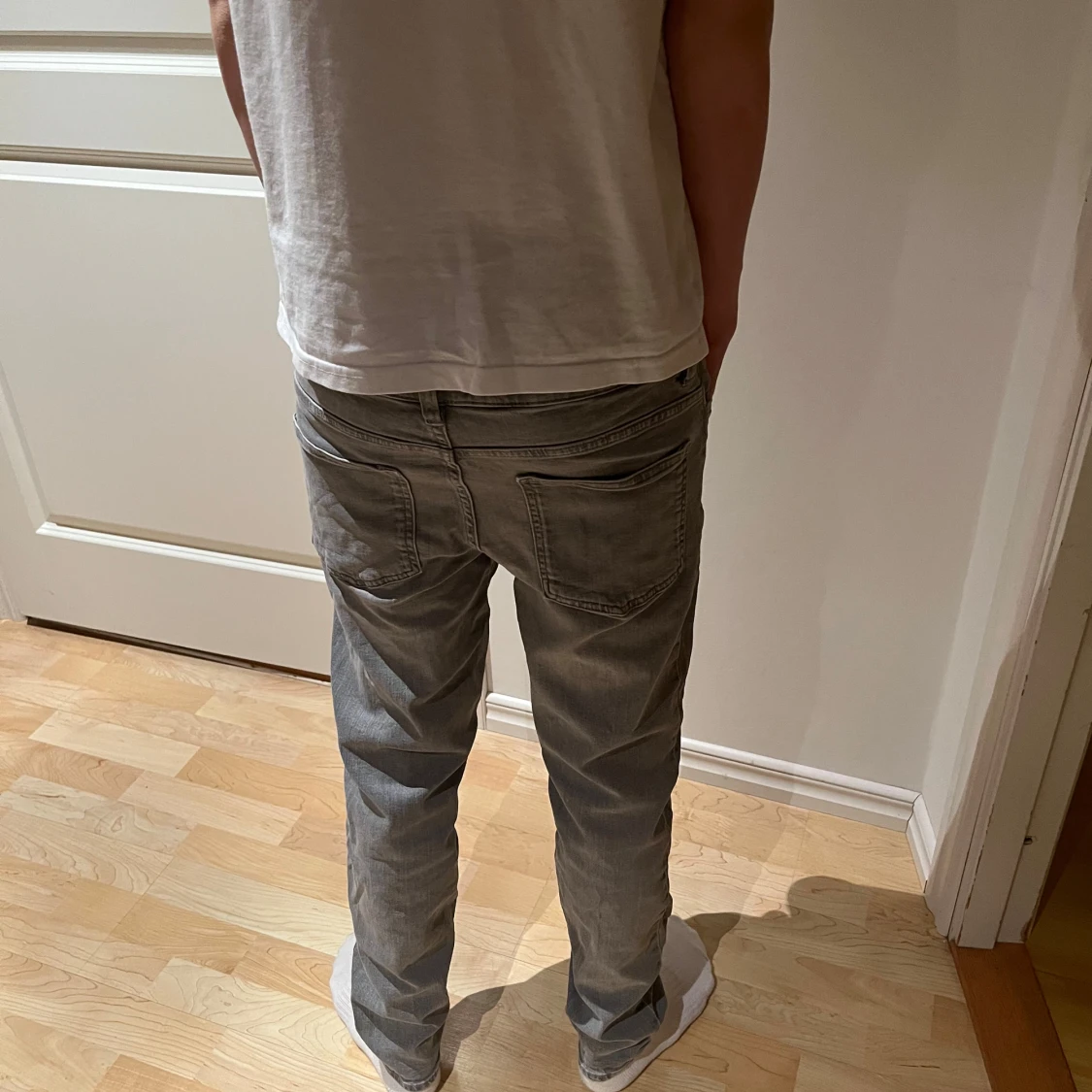 Säljer ett par grå jeansbyxor i bra skick. De har en normal passform och är perfekta för vardagsbruk. Byxorna har en klassisk design med fem fickor och knappgylf. Perfekta för både höst och vinter! Knappt använda