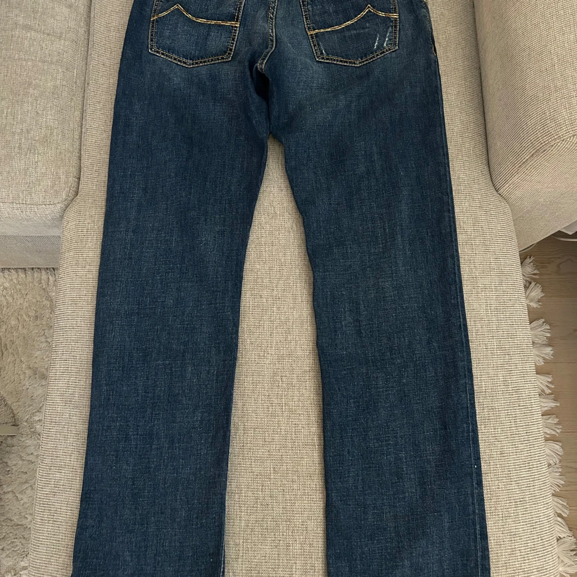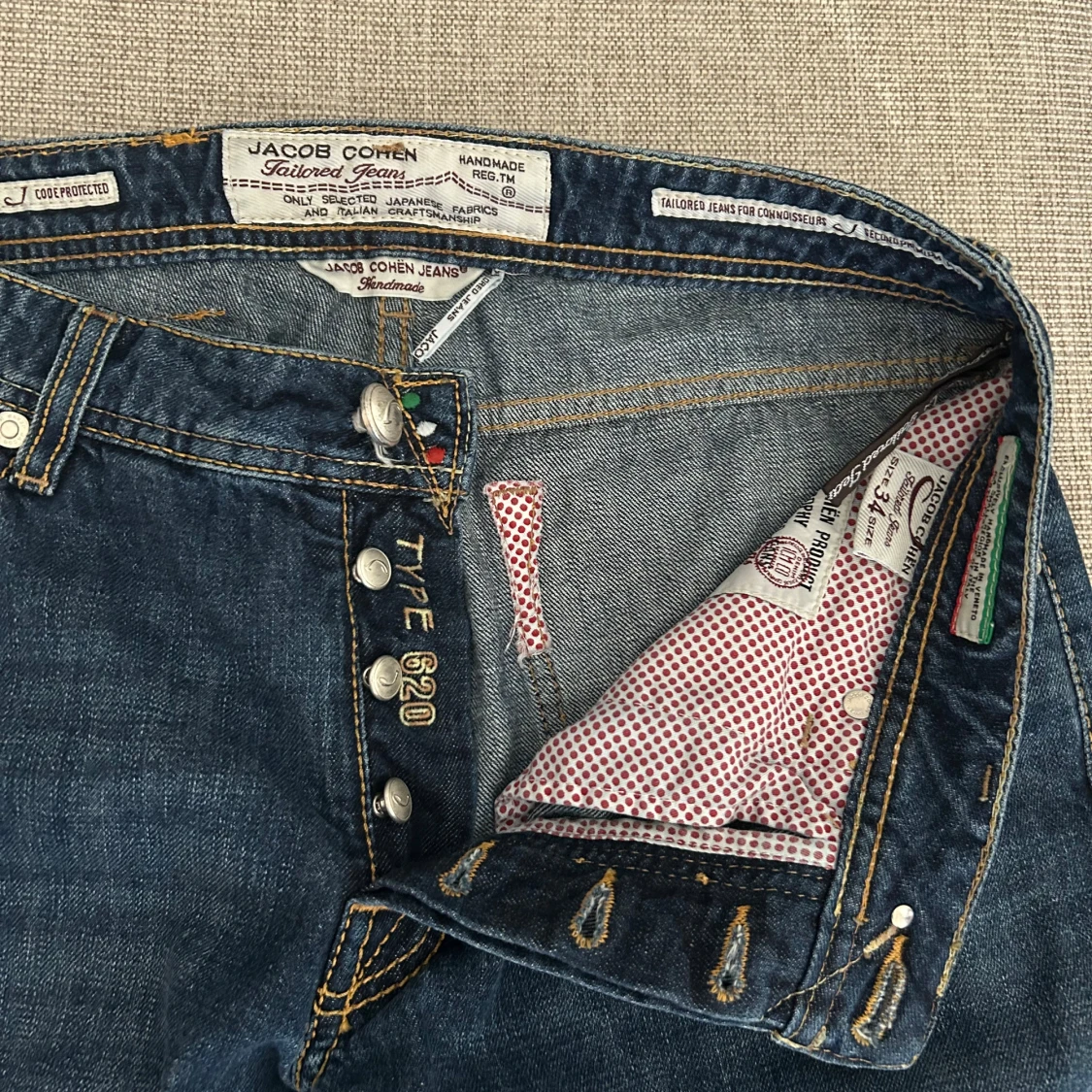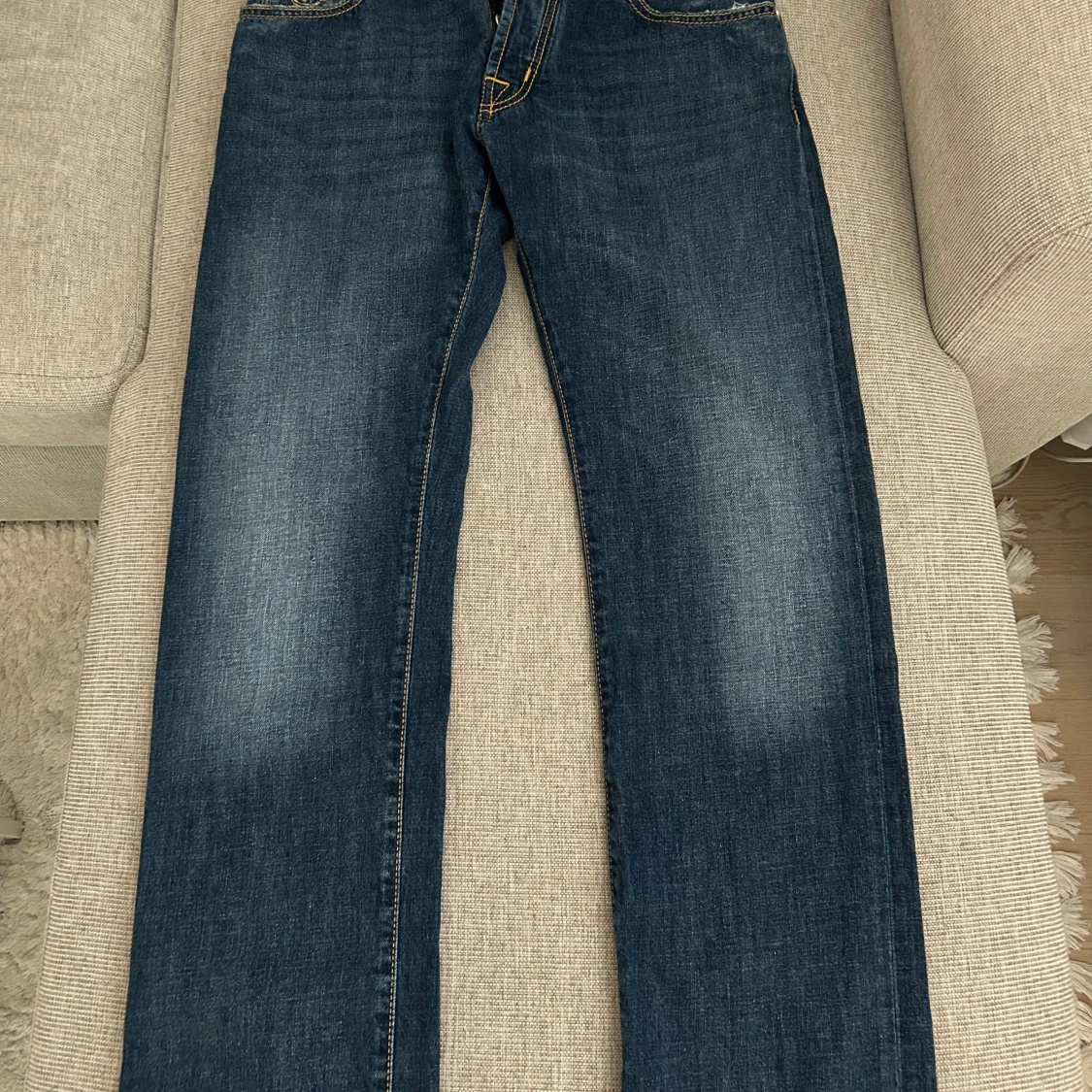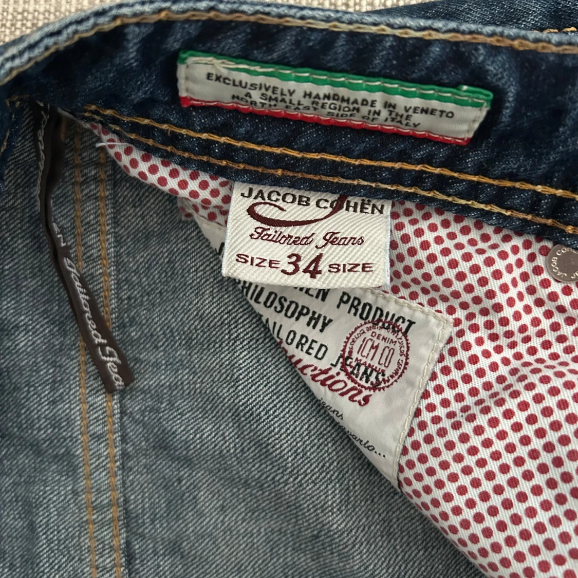 Säljer ett par mörkblå jeans från Jacob Cohën. Jeansen har rak passform och är tillverkade i ett slitstarkt denimtyg. Perfekta för dig som gillar högkvalitativa jeans i god passform. Nypris ligger på 4000kr. Kontakta vid frågor!!