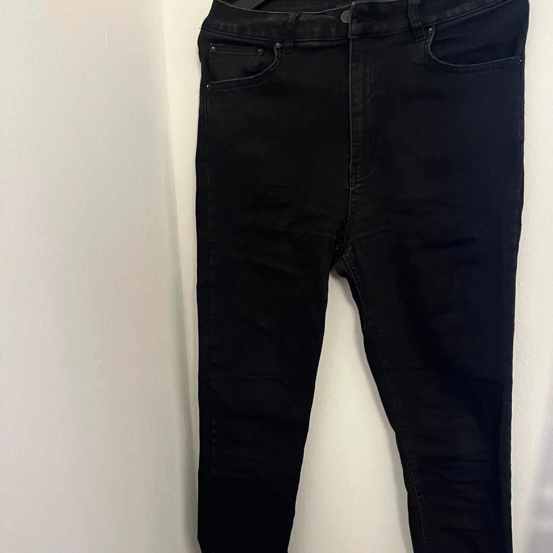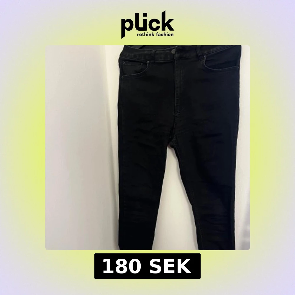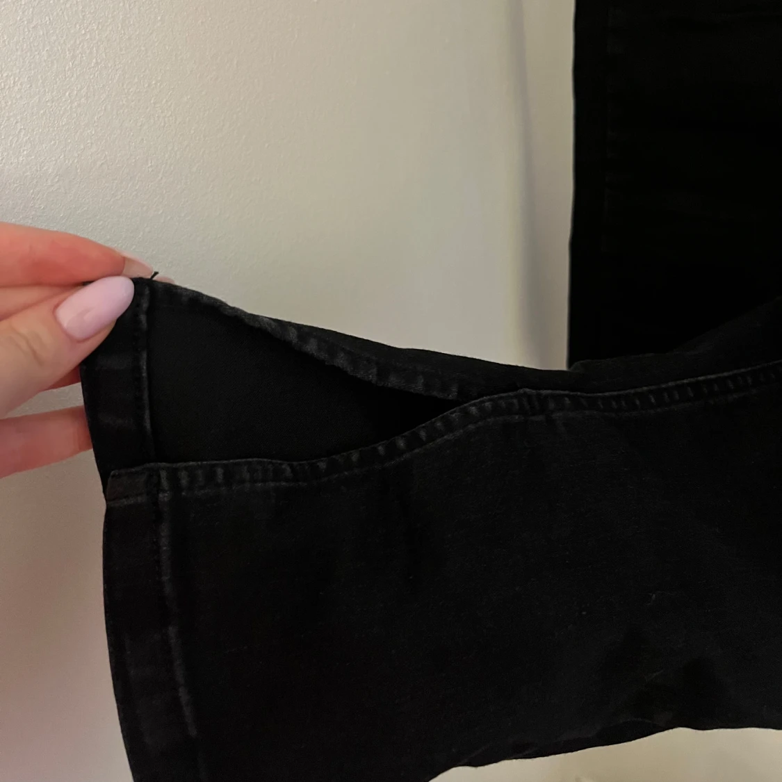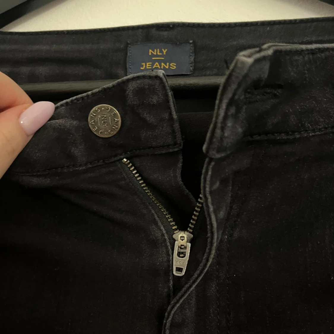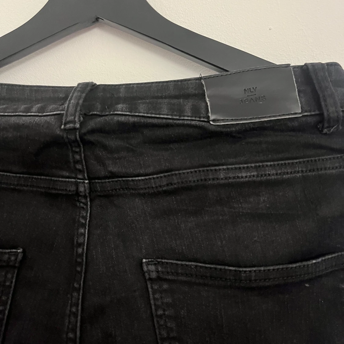 Snygga svarta jeans från NLY Jeans. De är ganska skinny och nertill har de en slits. Strl L, köpta för 459 kr