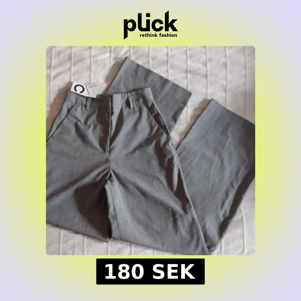 Skitsnygga vida kostymbyxor i grått med ett diskret rutigt mönster. Byxorna har hög midja, vida ben och hällor för bälte. Tillverkade i ett mjukt och lätt material (av polyester & viskos) som känns skönt mot huden. Perfekta i sommar för en clean och stilren look. Är oanvända med tags kvar.