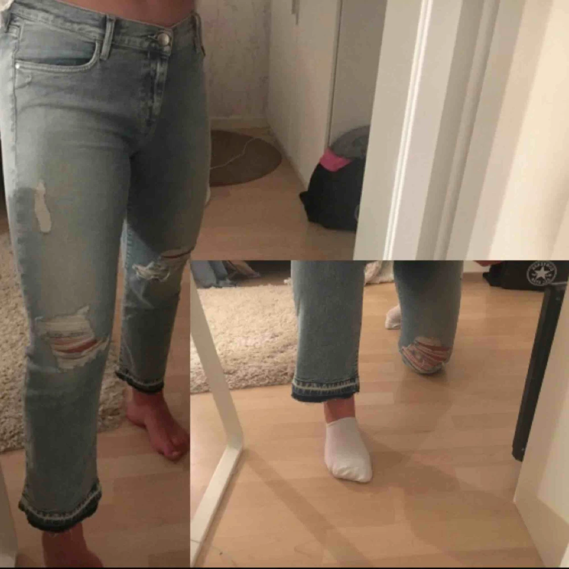 snygga jeans från Calvin Klein! Köpta för över 1000 kr och aldrig Använda! Har snygga detaljer som hål på knäna och mörkblåa längst nere på byxorna! Är som en S/M och jag är 160 cm lång och det passar mig! Det sitter jätteskönt! Frakten betalar man själv