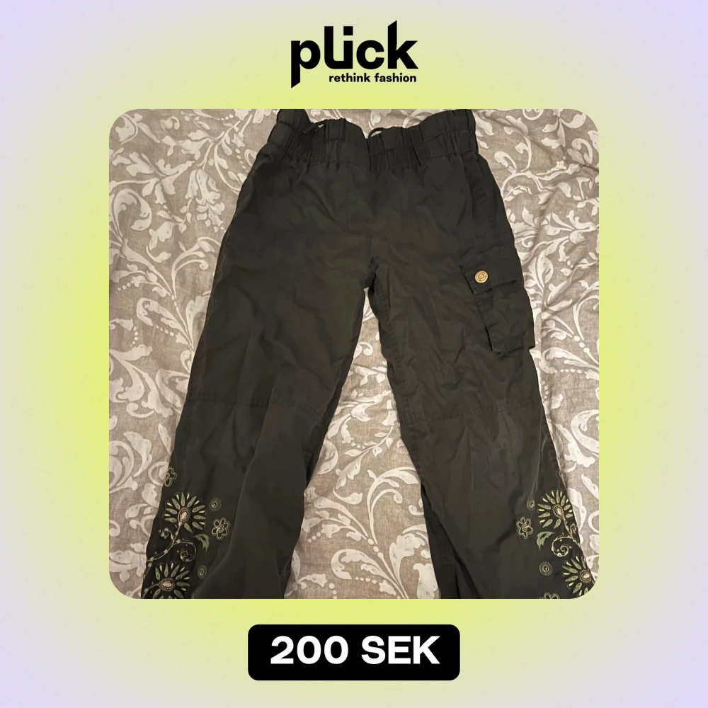 Säljer ett par gröna caprice med snygga broderade blommor i grönt och beige. Byxorna har en loose passform och en praktisk ficka med knapp på sidan. Perfekta för en bohemisk stil eller en avslappnad dag ute. 🌼