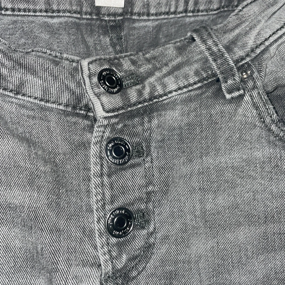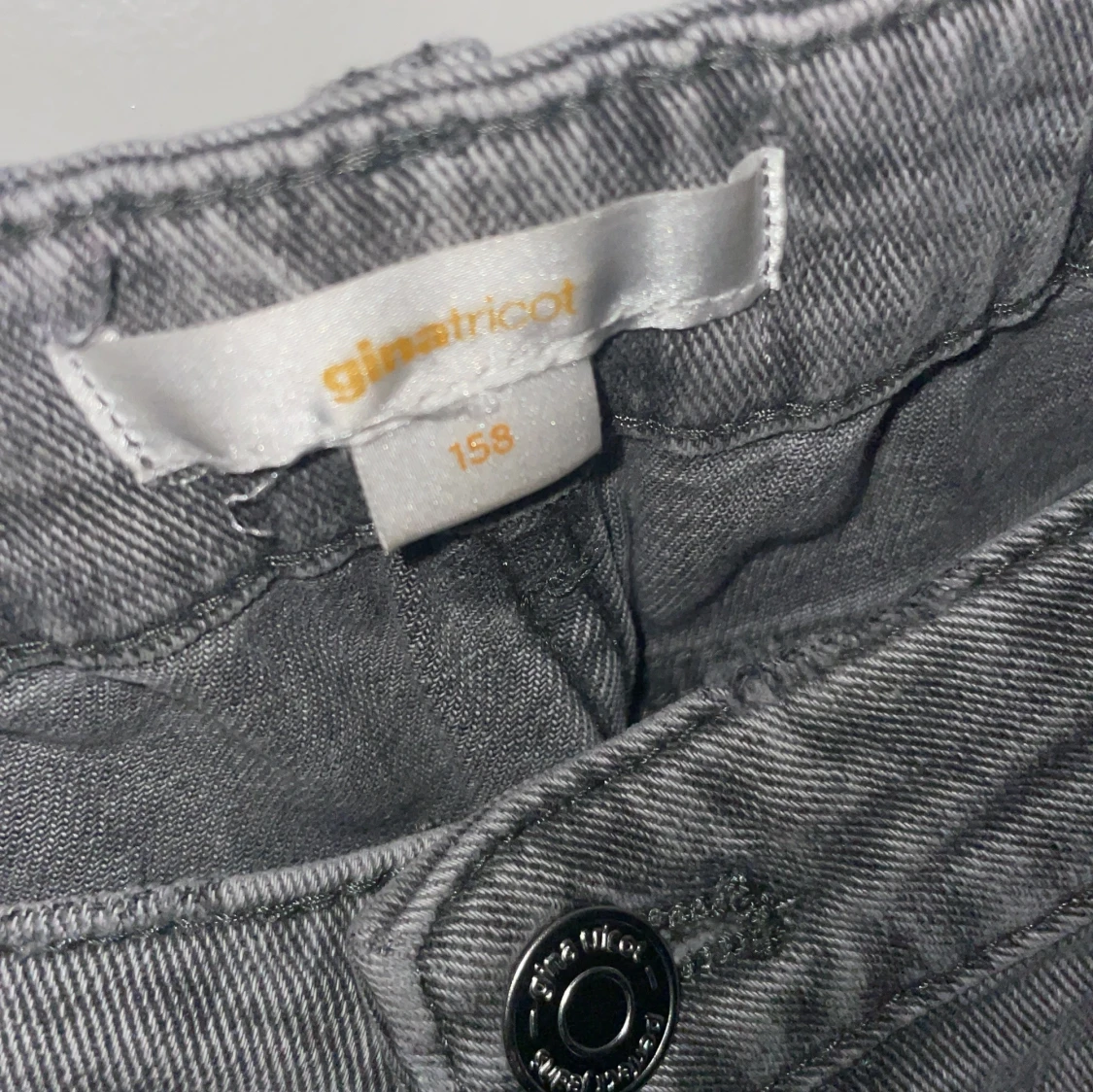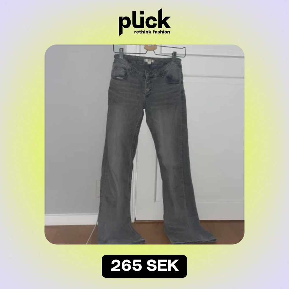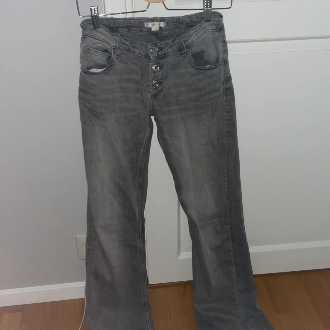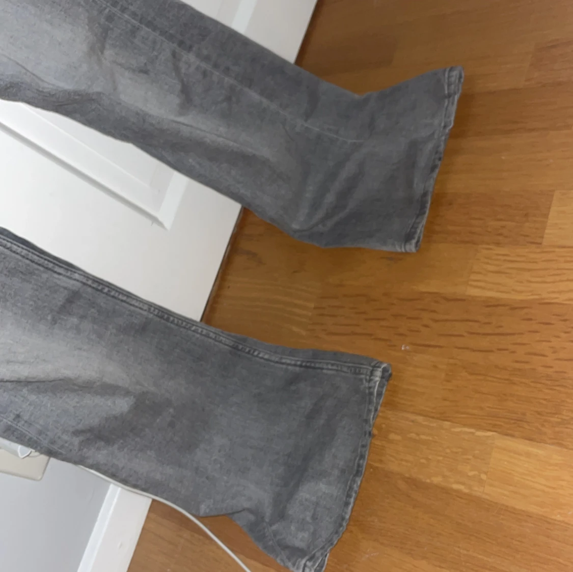 Säljer ett par grå jeans med en cool vintage-look. De har en knappgylf och är i bootcut-stil, vilket ger dem en skön retro vibe. Perfekta för både vardag och fest! 🖤