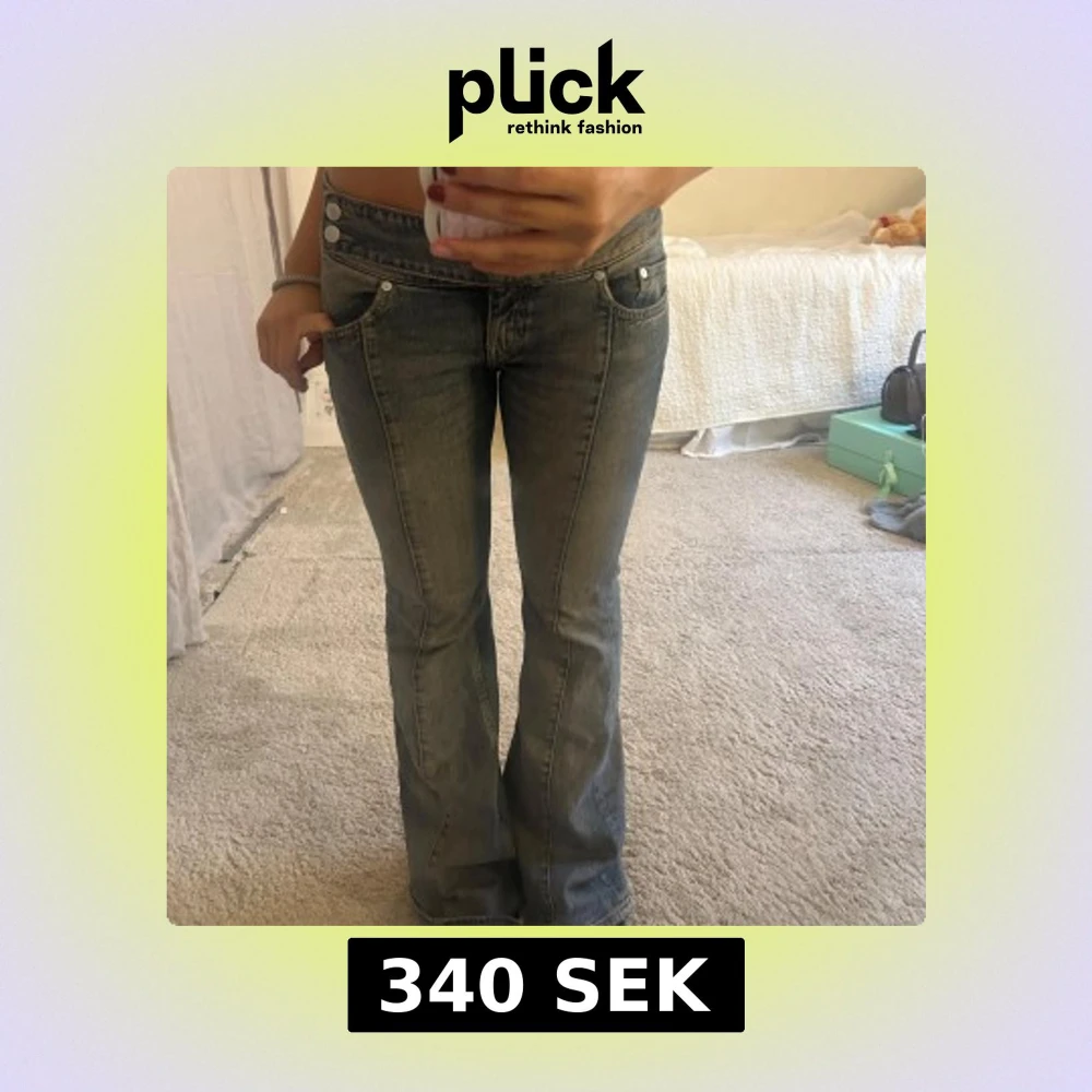 Säljer ett par bootcut jeans från Weekday i en snygg mellanblå tvätt. Jeansen har låg midja, två knappar framtill och inga fickor baktill. Lite stora på mig som har S/M så passar nog bäst på någon med M