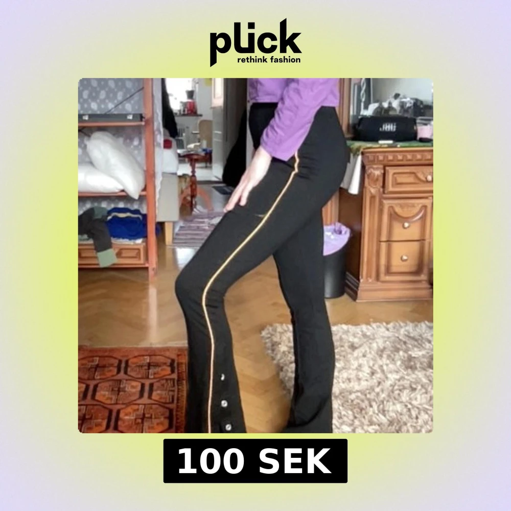 Snygga svarta byxor med en orange linje längs sidan och knappar vid bensluten. Längd: 104cm Bredd: 35cm
