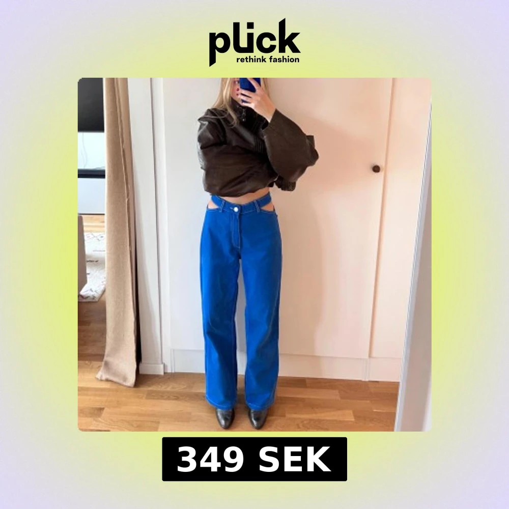 Koboltblåa jeans från Zara med unika cut-out detaljer vid midjan. Sparsamt använda. Byxorna har raka, vida ben och medelhög midja. De har kontrastsömmar som ger en cool look. Perfekta för dig som vill sticka ut med din outfit! Får alltid komplimanger när jag använder de☺️. (Det står storlek 36 på jeansen men dessa passar mer i storlek 34! om du har 36 kommer de vara för små) Jag är 158cm men har ca 6cm klackar på bilderna!