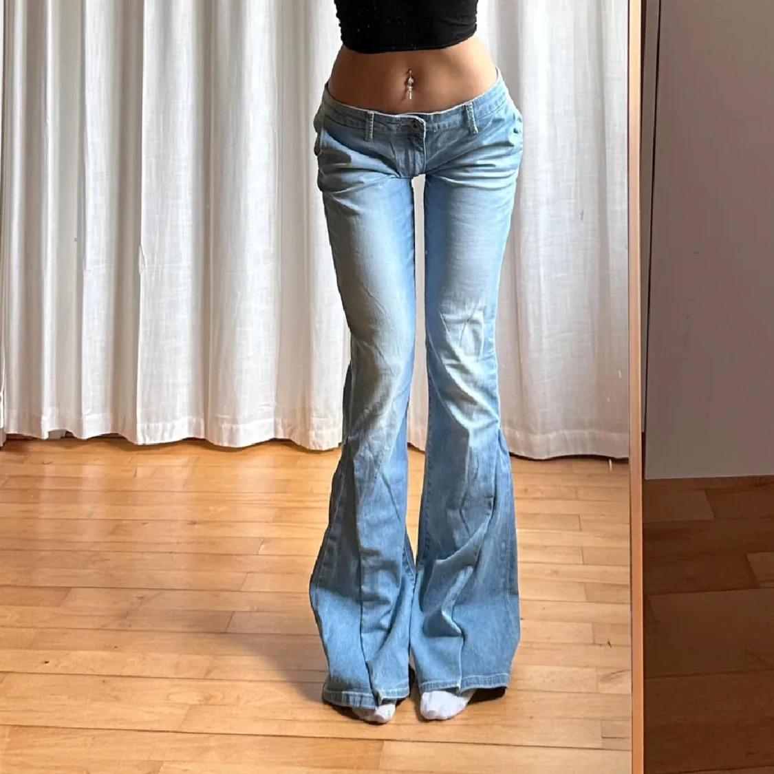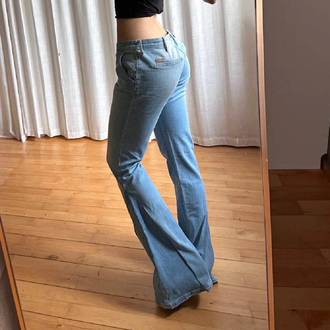 Säljer ett par vintage jeans från wrangler med snygg bootcut och låg midja. Midjemått 40 och innerbenslängd 88, hon på bilden är 165 men passar längre💗💗💗omsydda av tidigare ägare.
