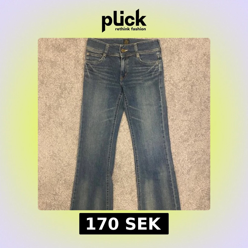 Snygga blå jeans med bootcut passform och coola bakfickor med lock och guldiga knappar. Jeansen har klassisk femficksdesign, kontrastsömmar och lätt slitning framtill. Perfekta för dig som gillar en avslappnad men trendig look. Midja rakt över: 35cm Lår: 24cm Innerben: 78cm