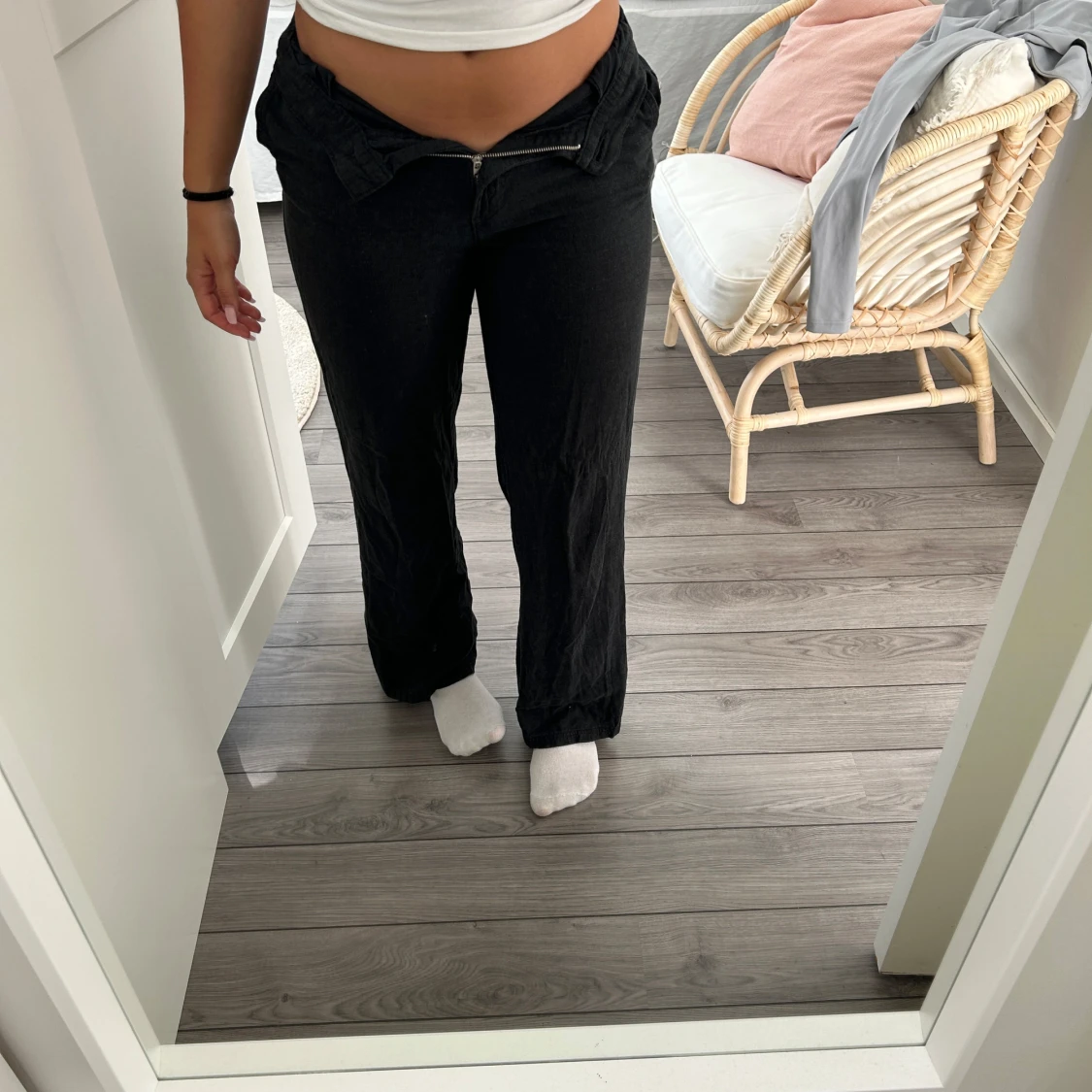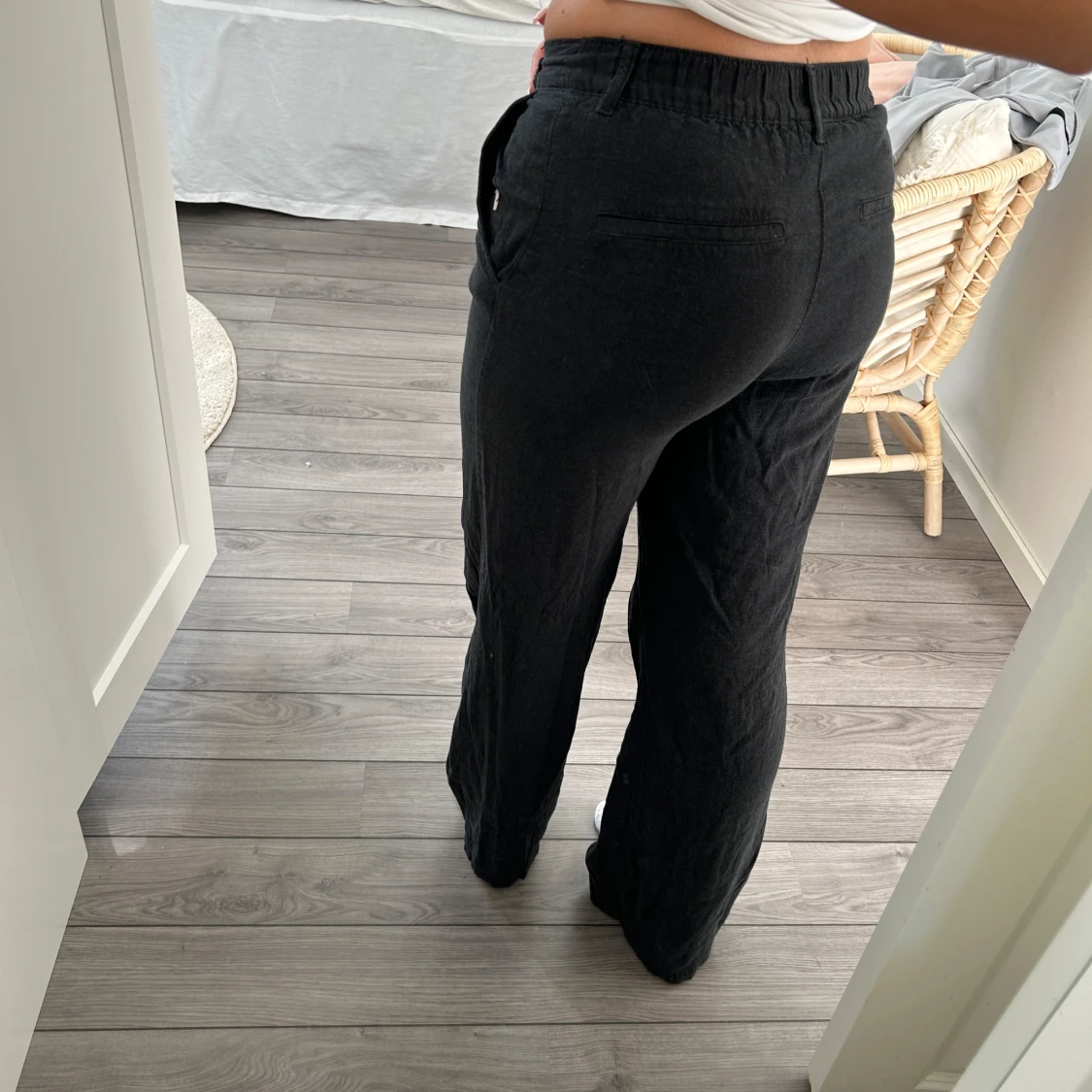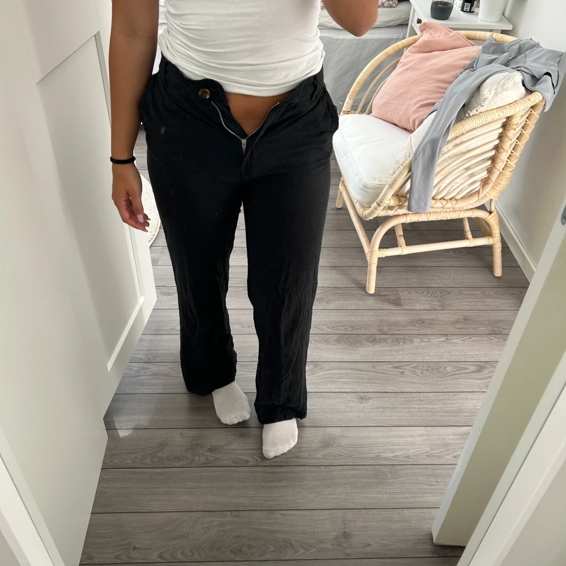 Superfina kostym byxor ish i linne material, mid waistade, o sitter bra i längden på mig som är 163🥰 Säljer för dom tyvärr inte passar längre, men i bra skick🥰