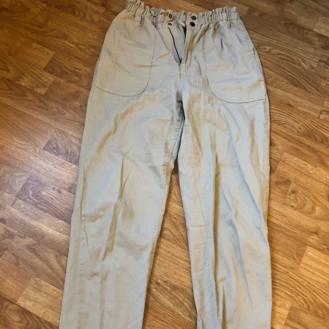 Jätte fina helt oanvända beiga ”kostym” byxor. Jätteskönt material och är helt i nyskick💓 de passar superbra att vika ner till lågmidjat! Stl S, 36/38 men passar xs och M också!
